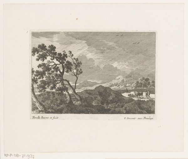 Editor: Okay, so we're looking at "Landschap met man die kudde voortdrijft," or "Landscape with a Man Driving Cattle," an engraving by Nicolas Perelle, dating from around 1673 to 1695. It's a pastoral scene. To me it feels kind of melancholy, despite the activity depicted. What captures your attention in this piece? Curator: You know, it's funny, melancholy is a good word. For me, the enduring appeal of baroque landscapes like these isn't just their visual beauty, but that strange mixture of the ideal and the everyday, the beautiful with…dare I say, boring? See the delicate lines used for the trees, contrasted with the frankly utilitarian depiction of the herder and his cattle. I wonder if the artist felt the same? Editor: The "boring" actually emphasizes how integral labor and agriculture were. It wasn’t all just romance. Curator: Precisely! It suggests a deeper story about how humans interact with nature – the mundane existing side by side with the sublime. Makes you wonder about their lives, their joys and frustrations, doesn’t it? Are those birds, or the products of our shared anxieties. Editor: Definitely. And noticing those subtleties brings it all to life! I wouldn't have looked beyond the surface before. Curator: It's about seeing not just what’s *in* the picture, but what the picture *tells* us, which of course, brings our experiences into the viewing. Editor: I like that—it shows the story hiding just beneath a "simple" landscape! Thanks!