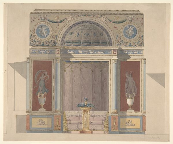 V. S. Léon rendered this design for a possible theater interior in watercolor and graphite on paper. The artwork gives us insight into the cultural values and social hierarchies of the time. The design emphasizes grandeur and opulence, meant for the wealthy and powerful. Note the elaborate ornamentation and details, like the intricate carvings, the rich colors, and the classical motifs which signal a desire to align with aristocratic traditions and project an image of wealth, taste, and power. The theater provided a space where social norms were reinforced and class distinctions were enacted and viewed. Consider how this design reflects and perpetuates notions of exclusivity and privilege, shaping the experiences and perceptions of both the performers and the audience. How might theater provide a space for challenging existing power structures, amplifying marginalized voices, and fostering social change?