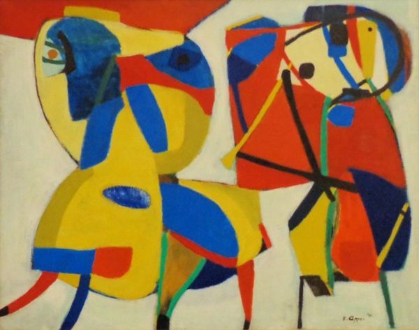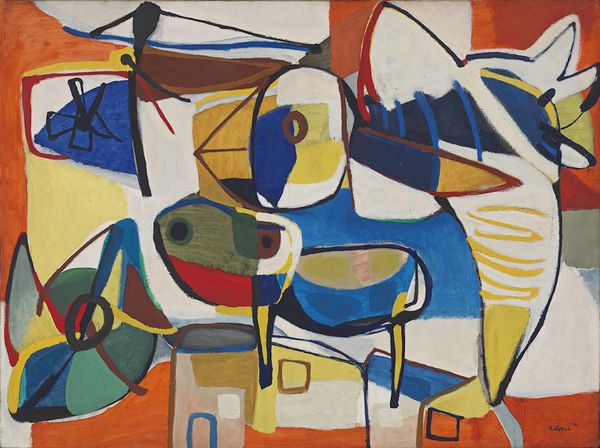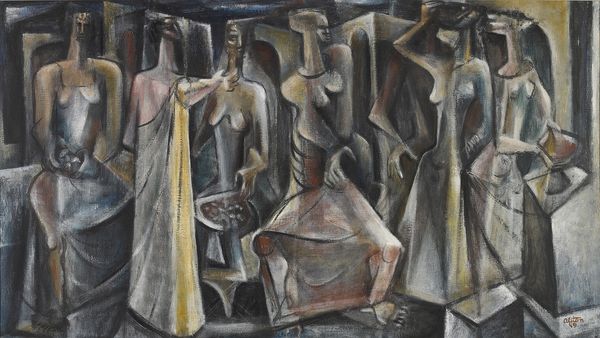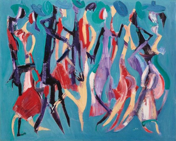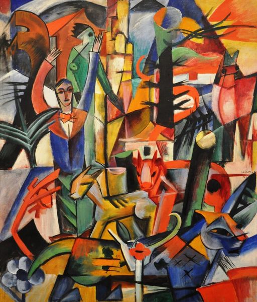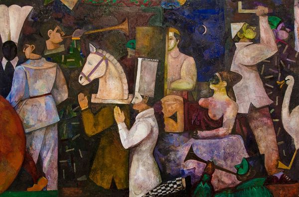 Curator: Sasza Blonder's "Kompozycja z defilujacymi," created in 1933, presents an intriguing visual experience in mixed media. Editor: It has this uncanny atmosphere, almost like a half-remembered dream. The color choices are fascinating – vibrant yet somehow muted, the planes disorienting. Curator: The artist merges elements of cubism and fauvism, resulting in a striking figuration executed with loose geometry. Note how color dictates the form rather than the other way around, especially when you observe how it delineates space, and how objects push or retreat within the pictorial structure. Editor: What strikes me, seeing the figures—soldiers, maybe, with a musician on what could be an elephant, is how art echoed political pageantry in the interwar period. Abstraction still served specific socio-political narratives. Is this a celebration, or a satire? It is difficult to say. Curator: I think we must consider it within the artist’s unique visual vocabulary rather than relying solely on political interpretation. The work balances expressive freedom and pictorial control. The raw application of color and abstract forms gives an intense presence. The overall composition transcends the identifiable aspects within it. Editor: Agreed. And that is perhaps what keeps us returning to such works, trying to decipher these artistic languages, to see whether art of that era echoed, challenged or somehow predicted those disruptive, uneasy times. Curator: Exactly. These visual puzzles require attentive contemplation to better understand how elements contribute to the broader aesthetic experience. Editor: The interplay of figuration and Fauvist coloration offer us today some historical hints and food for thought.