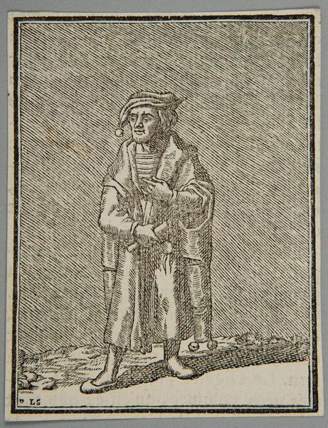 Curator: This is Pierre Le Sueur's "Plate One," a small print housed here at the Harvard Art Museums. Editor: There's a striking starkness to it. The tight hatching creates this interesting shadowy effect, almost like a stage set. Curator: It really emphasizes the materiality, doesn't it? The labor involved in each individual line cut into the plate. Consider the social context, too—prints like these made art more accessible, circulating images and ideas. Editor: Absolutely, and it's the formal elements that give it power. The diagonal lines create a sense of movement, drawing your eye across the composition. Curator: And the figure's attire, his tools—they speak to a particular class, a specific kind of worker or traveler. Editor: Indeed. It leaves me pondering how such simple lines can evoke so much depth and narrative. Curator: It is a wonderful image to consider.