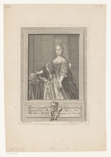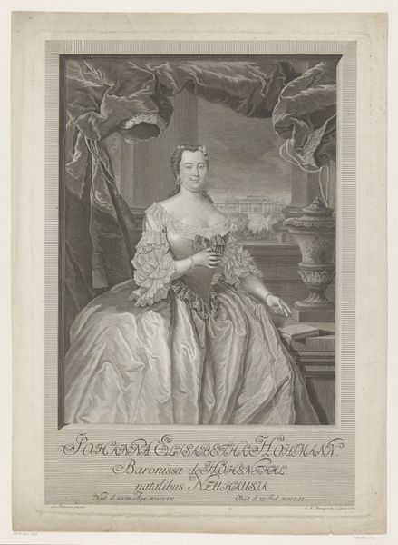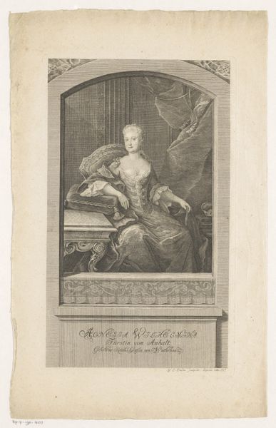 This is Christian Fritzsch's portrait of Charlotte Louise Schröder, made with engraving. The composition immediately directs our gaze to the sitter, framed within an oval border that suggests a mirror or window. This framing creates a sense of distance and elevation, while the heavy drapery and stone base add weight and presence to the image. Notice how Fritzsch uses line and texture to define form and space. The delicate lines of Schröder's face and dress contrast with the more textured rendering of the fabric and background. These elements not only convey material qualities but also engage with broader ideas of representation and reality. By framing Charlotte within a mirror-like oval, Fritzsch prompts us to consider the nature of portraiture itself. Is it a reflection of reality or a carefully constructed image? The semiotic system of signs and symbols within the artwork invites us to consider the interplay between surface appearance and deeper meaning. Art doesn't have a fixed meaning, it's a site of ongoing interpretation.