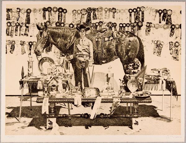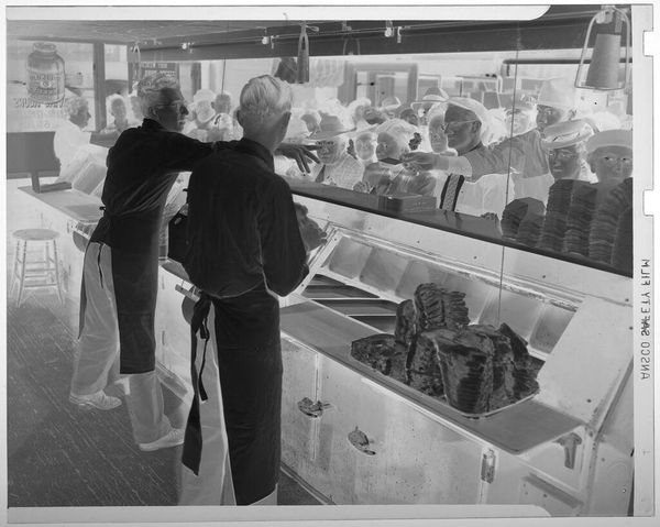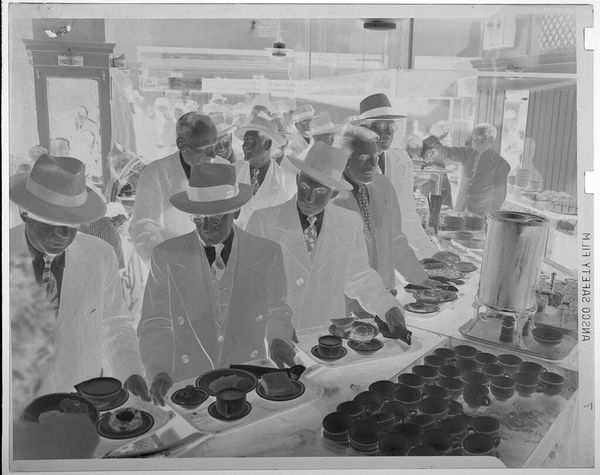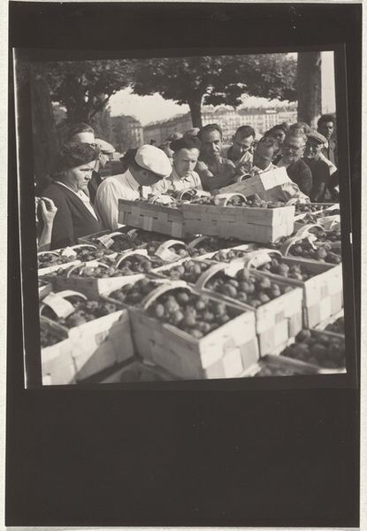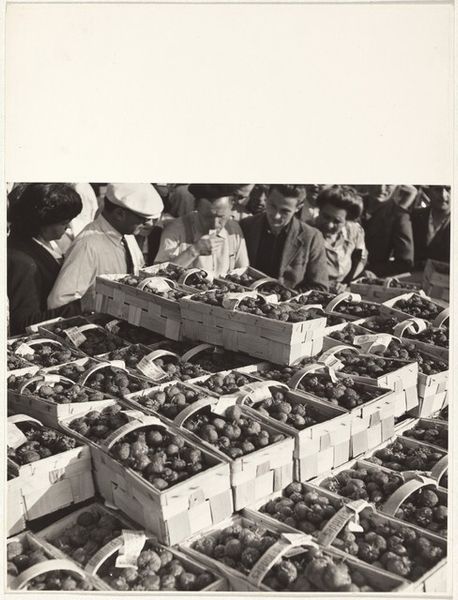 Editor: We are looking at "Market--People," a gelatin silver print photograph by Robert Frank, created between 1941 and 1945. The arrangement of objects in the photograph is chaotic but also, somehow, captures the lively atmosphere of a busy marketplace. How do you interpret this work through a formalist lens? Curator: What strikes me immediately is the tonal range. Frank's use of greyscale is masterful. Note how the subtle variations in shade create depth and dimension despite the compression inherent in photography. The composition itself is densely packed, reflecting the subject matter. Does the artist favor a particular point of view? Editor: Not that I can see, though the high vantage point gives us a bird's-eye perspective of the people and objects. How does that perspective influence the overall structure? Curator: Precisely! The elevated perspective flattens the scene, emphasizing the graphic elements. Observe how the horizontal lines formed by the tent top and the vendor's table intersect with the vertical figures, creating a complex interplay of planes. Moreover, consider how the differing textures—the smooth faces against the rough-hewn merchandise— contribute to a dialectic, do you agree? Editor: I do! The juxtaposition highlights the contrast between the human element and the manufactured goods. Did Frank intend this, or am I reading too much into it? Curator: Intent is ultimately unknowable. But we can see that he made careful choices about lighting and contrast to give particular objects greater visual weight than others, contributing to the work's overall balance. Notice, also, the shallow depth of field. How might this be interpreted from a formalist stance? Editor: I see. By keeping most of the image slightly out of focus, it draws attention to the shapes and forms rather than individual details. I now understand better how we can analyze a photograph like this, not for *what* it depicts, but how *it* is composed. Curator: Exactly. By examining elements such as tone, texture, and compositional arrangement, one discovers much about the formal attributes of the art.