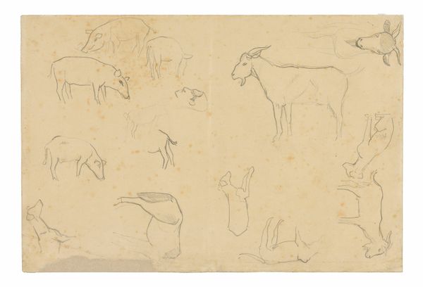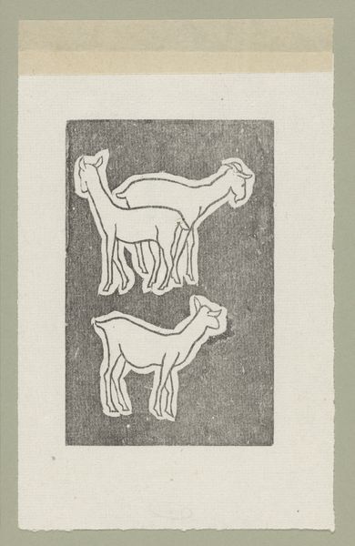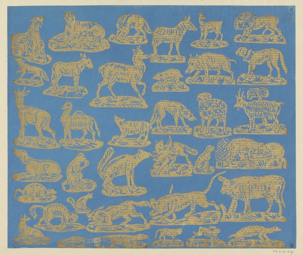 This print, titled "Blad met verschillende dieren," was made by Dessauerschen Buntpapierfabrik. The print presents a field of diverse animals arranged in rows. Each creature, rendered in a uniform golden hue, is defined by a network of parallel lines, creating texture within each form, unifying the composition. The animals, including bears, horses, and lions, are depicted in profile, heightening their recognizability. This ordered arrangement echoes the principles of structuralism, where meaning is derived from the relationships between elements within a system. The print does not seek to create an illusion of depth or perspective but focuses on the clear articulation and categorization of forms. This visual coding reflects a drive to classify and understand the natural world through systematic representation. The consistent color scheme and pattern might undermine traditional hierarchies. Each animal becomes part of a larger, democratized collection. This leveling could be seen as a challenge to fixed meanings and an invitation to reinterpret the relationship between species.