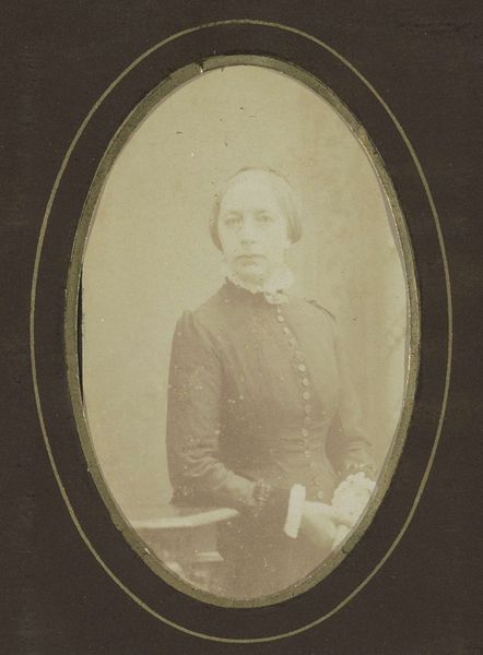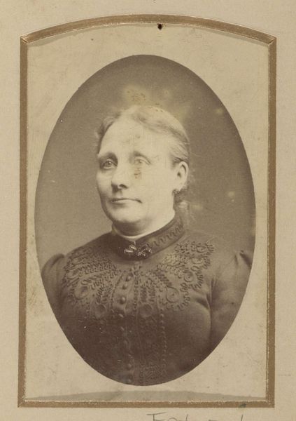 Editor: This gelatin-silver print, “Portret van een vrouw,” by Carel Gustaaf Hisgen, probably created somewhere between 1884 and 1897, is fascinating. The oval frame and sepia tones lend it a distinctly melancholic air. What do you see in this piece? Curator: Oh, the sweet melancholia of days gone by! To me, this portrait speaks of more than just an era, but of untold stories, secrets locked within the gaze of a woman we know nothing about. It is history caught in a shimmering dance of light. Consider, if you will, how Hisgen utilizes photography not merely as documentation but as an emotional canvas. Notice her gentle posture...does it communicate the vulnerability of existing? Does this invite questions about self, existence and maybe also memory and preservation? Editor: It does seem quite staged, perhaps indicative of the period’s photographic conventions. What strikes me is the contrast between the subject's plain attire and the elaborate gilded frame, but I'm wondering what's your sense of its broader context? Curator: You've stumbled onto something pivotal there. That tension – the quiet austerity against a decorative flourish. That frame screams bourgeois respectability while she...well, her gaze avoids us. It seems almost she's an actress stuck in a part, longing for another play. As the technology shifted, do you see her struggling within the expectation of realism in a world obsessed with accuracy and 'Truth?' And if so, can we, through her photograph, liberate her from this antiquated construct? Editor: It's so interesting how much you can unpack from a simple portrait. I appreciate how you highlighted that tension. I guess photography of the time becomes almost performance in itself. Curator: Precisely! These 'silent' actors from history urge us to question their narratives; not just observe the image. The layers, like photographic chemicals, await activation by an engaging spectator such as yourself. And that, my friend, is the delightful chaos of the art.