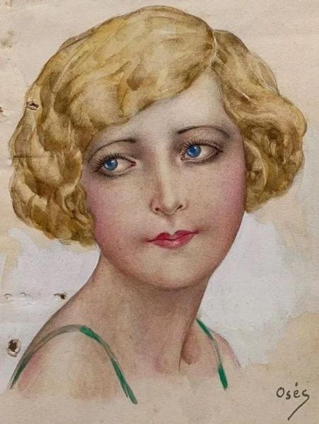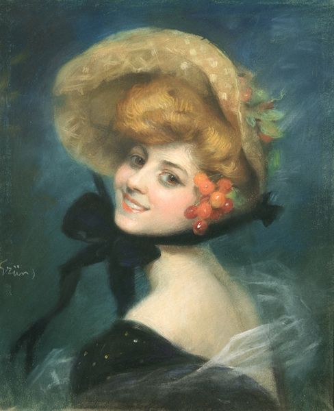 Curator: Immediately, I'm struck by its dreamlike quality and muted tones, almost like a faded photograph. Editor: We're looking at "Carnival, Lily," a gouache and colored pencil painting from 1928 by Gerda Wegener. Curator: "Carnival" indeed. A woman in a massive, almost absurdly large hat holding a green mask, it conjures up ideas of societal roles, persona, masquerade. The mask both conceals and reveals. It's a visual paradox common during the Art Nouveau and Intimist period in the arts. Editor: The Art Nouveau influence is certainly pronounced in the sinuous lines and decorative details, like the confetti. Note the color palette dominated by soft creams, blush pinks, and subtle greens—an interesting harmony that is in contrast to what is traditionally perceived with the color usage in a 'carnival.' Curator: It certainly begs the question: what is she masking and revealing in Wegener’s carnival? The figure stares sideways and beyond with self-possession in the midst of possible revelation of self. It hints at gender fluidity. A relevant biographical connection for those familiar with Wegener’s art and life. Editor: Let’s not disregard the very soft application of the paint and how it adds to the atmosphere of lightness but it is a visual trick. There is tension within Wegener’s work due to what the composition attempts to present: a figure of freedom. However, the tension lies in its visual fragility, which points at something profound. Curator: Fragility is perceptive when contextualized with the personal. Given Wegener's background, Lily as an icon transforms. No longer just an individual at carnival, but an icon in the transgressive act of self-definition in the face of cultural constraints. Editor: Absolutely. Looking at the composition again and Wegener's careful rendering, there is such delicate precision. Almost at odds with the boldness of the theme—masking is about more than surface and extends to something else profound and personal. Curator: These layers—the historical, personal, and symbolic are compelling. A silent carnival with loud questions asked beneath the surface. Editor: Indeed. Wegener's choices, formal as they are, present much more to consider once we appreciate all the dimensions at play.