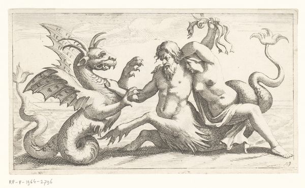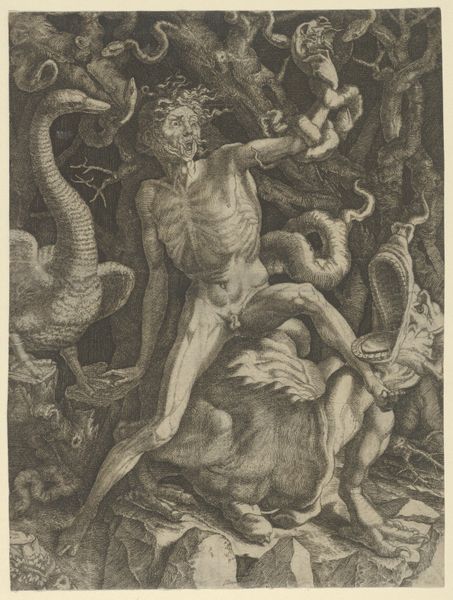 Editor: This engraving, "Hercules Killing the Lernean Hydra" from around 1528, depicts that famous scene. The density of line work creates a pretty dramatic image, but all those hydra heads jumbled together are a bit confusing to untangle at first glance. How do you interpret this work? Curator: The confusion is key, isn't it? The Hydra, multiple heads sprouting anew when severed, is an ancient symbol, deeply rooted in anxieties about unchecked proliferation. Think about the context: 1528. What's proliferating then? Perhaps religious schisms, the spread of new ideas enabled by the printing press itself. Editor: So, the Hydra isn't just a monster. It's a symbol of something larger going on at the time? Curator: Precisely. Hercules, hacking away, embodies the struggle to contain these anxieties. Consider his Herculean effort. Isn’t the act of endless battling a symbolic one, indicative of larger societal anxieties being grappled with through allegory? Also, look at the wild-haired figure and his muscular physique—he harkens back to the classical ideal. It becomes a story about imposing order on chaos, of classical values taming the monstrous unknown. Editor: It's fascinating how much cultural meaning is packed into one image. Curator: Visual symbols evolve, taking on new layers of meaning with each telling. The engraver isn’t just illustrating a myth; they are engaging in cultural memory, tapping into our collective understanding of good versus evil and of order against chaos. Editor: It completely shifts how I see the piece, I’m going to have to explore this symbology further. Curator: Exactly, by viewing and thinking we can explore. What have you learnt from the symbolic, metaphorical density when viewing this work?
