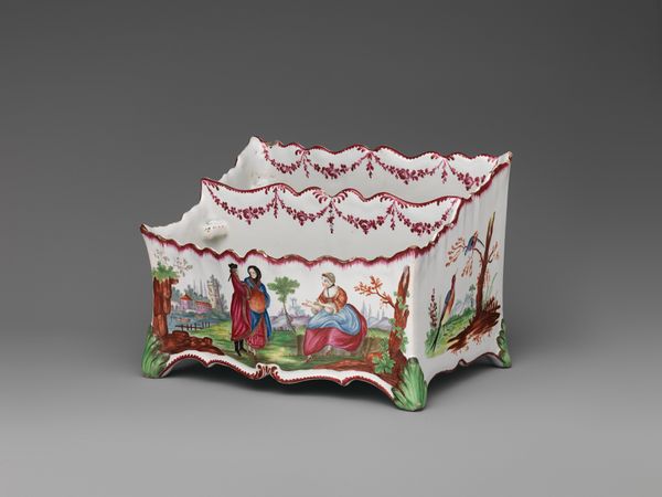 Editor: This little "Snuffbox," made between 1745 and 1755 by the Meissen Manufactory, is such a whimsical ceramic piece! It’s like holding a tiny, painted world. All those tiny figures—how fun. What leaps out at you? Curator: The delightful decadence of it all! Think about powdered wigs, secret rendezvous in pleasure gardens, and illicit tobacco habits. This isn't just a box; it's a whispered invitation into a very particular social world. Do you notice how the figures aren't just placed, but actively interacting within this landscape? Editor: They do seem lively! The details, especially given the size, are incredible. Almost like tiny actors on a porcelain stage! So it really shows you something about the period it was made in? Curator: Precisely. This isn’t about religious piety or stoic virtue like in earlier art. Instead, it's about playful encounters, perhaps even a bit of scandal, all encased in luxurious porcelain. Look at the landscape – idealized, picturesque, meant for strolling and dalliances. Almost a dream world. Editor: So it’s more than just pretty…it represents a shift in values, doesn't it? Curator: Absolutely! Think about who could afford such a trinket: aristocrats indulging in a refined, playful lifestyle. Now imagine them pulling this out at a social gathering. The statement they're making! How different from pulling out say…a cell phone, today. Editor: Right! It’s all about signaling wealth and status…though perhaps with a bit more artistry and intrigue than a smartphone case. I see this little world with a different light, now. Curator: Isn't that marvelous? A little snuffbox opens up a whole world of social history and aesthetic delight. Imagine all the secrets it held, the gossip it overheard!