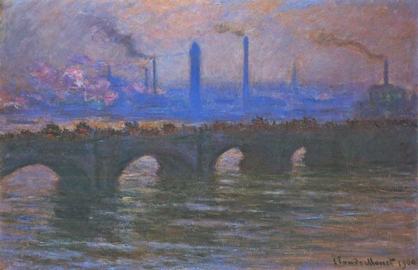 Curator: There’s an ethereal quality to Monet’s "Waterloo Bridge," painted in 1901. The entire scene shimmers. Editor: It really does! My first impression is of something shrouded – mystery in plain sight. It is hard to believe it's London. I see the bridge alright, and something resembling buildings in the background, but the overall mood is incredibly dreamy and subdued. Curator: Dreamy's a perfect word. The color palette certainly contributes; it's dominated by muted blues and lavenders that dissolve outlines. Even the sun feels soft, as if diffused through layers of fog. What do you make of those plumes of smoke rising in the background? Editor: For me, those plumes transform the painting into something more complex than a mere city view. The steam almost takes on the feeling of exhalations or sighs rising from the heart of the city. As in a sort of mythical presence. London as dragon, maybe? Curator: Haha! I like that, though Monet might just say they are evidence of the industrial revolution. But the symbolism could well be present if only by chance. He made several paintings of Waterloo Bridge, each capturing a different atmosphere, and it's easy to read a sense of romantic yearning or nostalgia into the series. Editor: Yes. When I look at this canvas, it’s not only what’s painted, but also how the atmospheric effects create such mood and feeling. One might even see a premonition in those smokestacks – something that speaks to a world moving away from clear forms into something vaguer, and less defined. A truly remarkable feature. Curator: Indeed, Monet takes an identifiable cityscape and transmutes it into a poetic expression. There is something enduring about how he saw those fleeting moments that continues to intrigue us. Editor: Absolutely. He seems to suggest more than he actually depicts. Like a fading memory or half-remembered story, and in a manner of speaking that feeling is the most permanent element in this picture. It is quite lovely to consider.