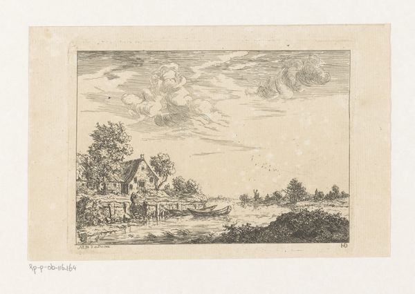 Editor: Here we have a print from between 1796 and 1856, "Watermolen in een landschap", or "Watermill in a Landscape," by Reinierus Albertus Ludovicus, Baron van Isendoorn à Blois. It's an etching, and it gives me such a feeling of peaceful simplicity. The composition, with the mill on the left and open landscape on the right, is interesting. What do you see in this piece? Curator: It breathes with a life both vigorous and hushed, doesn’t it? Look at the burr and soft textures achieved via etching - and just imagine those landscapes; a scene pulsating with pastoral rhythm in the moment. A place caught between progress of the watermill with it’s industry and that slower-paced serenity. Have you ever felt yourself living between the grinding stones of progress and the beckoning quietude of nature? Editor: That’s a very evocative way to put it! I hadn't thought of the tension between progress and nature. The watermill now seems less peaceful and more like an intrusion, almost. Curator: Indeed, this push and pull. Look at the figures to the right - almost secondary in scale; so diminutive compared with the mass of the watermill. What do you suppose this suggests? Editor: Maybe it's about humanity's place within, or even against, the landscape? Or that relationship changing because of technology. Curator: Precisely. It whispers questions of man's place amidst it all. Of ownership, encroachment. It asks us to contemplate if our pursuit of "more" steals a deeper serenity. But perhaps I am waxing too poetically for a simple watermill! Editor: No, not at all. I think seeing that conflict makes the work so much richer, so thanks. Curator: And thank you, your question brought it all back to life for me.