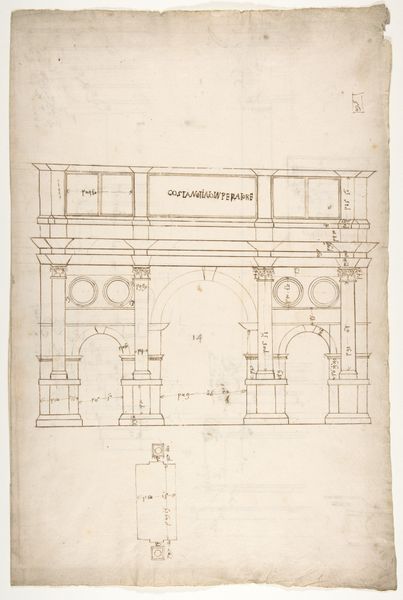 Curator: Today, we're examining an architectural drawing from the High Renaissance, likely created between 1500 and 1560. It is attributed to an anonymous artist and offers a plan and elevations for a funerary altar and paneling, possibly intended for the Oratorio della Santa Croce at S. Giovanni Laterano. Editor: It feels so precise. Even in its unfinished state, the balance and order create an atmosphere of solemnity. Almost like a stage set. Curator: Observe the line work, Editor. Notice how the artist utilizes hatching and cross-hatching to indicate depth and shadow, contributing to the overall sense of three-dimensionality. The architectural elements are rendered with precision. Editor: The context is so vital here; funerary altars often commemorated wealthy patrons who enabled art. Their memories literally became enmeshed within its stonework. Did they truly comprehend how they’d be remembered? Curator: One cannot overlook the visual harmony in the columns, the meticulously rendered entablatures, and the decorative swags. See how these contribute to the overall symmetry? Editor: Symmetry and power often go hand-in-hand. The Renaissance emphasis on these classical elements wasn't just about aesthetics, it projected a vision of restored imperial authority. The church had the power. Curator: True, the symbolism of these elements is multifaceted. The Corinthian capitals, for instance, with their acanthus leaves, point towards ideals of refined beauty and classical erudition. The architraves show a knowledge of ancient architectural conventions. Editor: Yet funerary art had so many meanings for diverse beholders. Who might have viewed this design, what class, sex, even occupation may have helped people read it. Curator: Ultimately, this architectural drawing showcases the Renaissance commitment to classical ideals. We discern within its framework a visual language of humanism, reason, and order. Editor: Well said. But remember too, architecture acts like any record. It embodies its age, so decoding its patterns is always essential if one wishes to understand. Thank you.