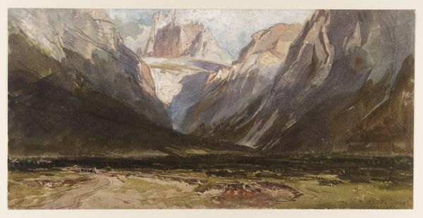 Editor: This is "Montana Landscape" by Albert Bierstadt. It seems to be oil paint on...something, but I'm not sure what. The scene feels so grand but also kind of muted with those browns. I wonder, what do you see in this piece? Curator: Well, let’s look at what's present: oil paint, yes, likely applied en plein air judging from the sketch-like quality and smaller size. But more than the depiction, let’s consider the production of the image itself. Where were Bierstadt's paints sourced? What was the labor involved in grinding those pigments? These landscapes weren't just about aesthetic appreciation of the land. Editor: So you're saying it's more than just pretty scenery? Curator: Exactly. This image reflects a specific moment in the industrialization of art. Oil paints, readily available, portable... facilitating rapid landscape painting. But think about the environmental and labor conditions required to make this consumerism possible. What does mass production do to our understanding of "Nature" and the making of art itself? What’s natural, and what's a commodity at this point? Editor: So, considering the labor and industrial context of making these oil paints almost challenges the romantic notion of the pristine landscape? Curator: Precisely. Bierstadt romanticizes a Montana, but does he address how those paintings become another element in the West’s exploitation? By separating art from its material context, we ignore a vital aspect of its meaning. We consume these views but what did this consumption and depiction truly cost? Editor: Wow, I never thought about landscape paintings like that, connecting them to industrial production. It’s made me consider the painting, and the paint itself, very differently. Curator: Indeed. It moves our perception from pure aesthetics to acknowledging the world of labor that enables us to contemplate these so-called 'natural' scenes.