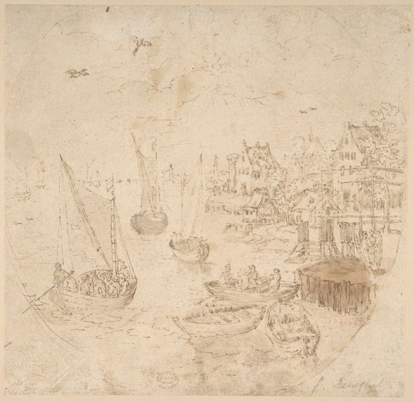 Editor: This ink and color on paper artwork, titled "Dragon Boat Regatta on Jinming Lake", was created by Wang Zhenpeng during the Yuan Dynasty. The scene seems so muted, and what strikes me is how the artist was able to create such an intricate landscape of bustling boats and buildings. What catches your eye about this work? Curator: The use of ink on paper is interesting. It wasn’t simply about representing the scene but about the material implications – where did this paper come from? How were the inks made? Were these local processes or tied to wider networks of trade and resource extraction? The Yuan Dynasty saw a complex social hierarchy, with artisans and labourers forming the base. Who was actually benefiting from this art's creation and circulation? Editor: So you are seeing beyond the image to consider who had access to the materials and the labour conditions to even produce it? Curator: Precisely. These artworks didn't appear from nowhere. Their creation involved entire systems of labour. How would considering the socio-economic background and trade routes for the ink and paper affect how we understand Wang Zhenpeng's work today? Editor: That is fascinating! Thinking about art in terms of production lines and raw materials… it brings a totally different meaning to “landscape.” The landscape becomes not just a place represented, but a set of resources mobilized. Curator: Absolutely! Considering the material origins pushes us to examine the bigger picture. I think paying attention to these physical elements of creation opens a deeper insight into its purpose and value, then and now. Editor: I'll never look at ink on paper the same way again. I am now realizing the importance of all the "things" that constitute art.