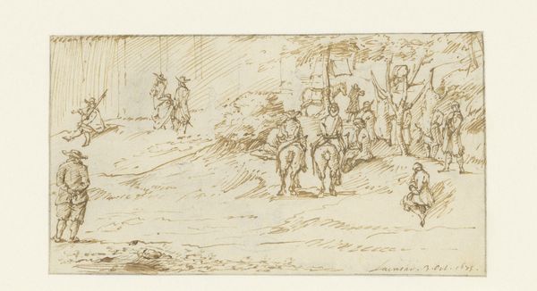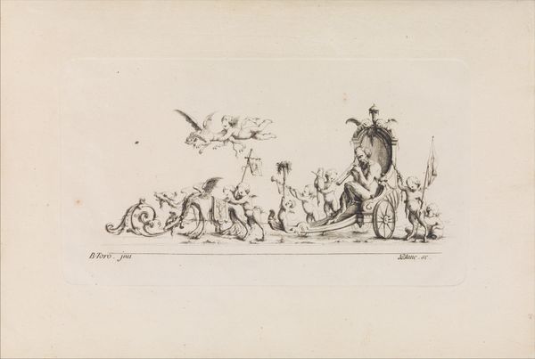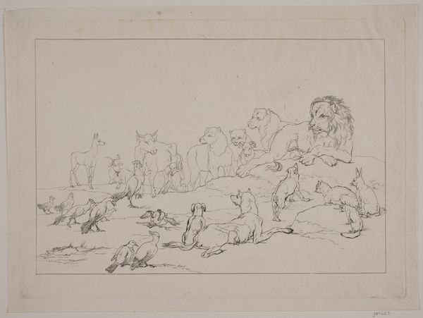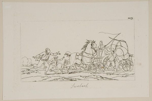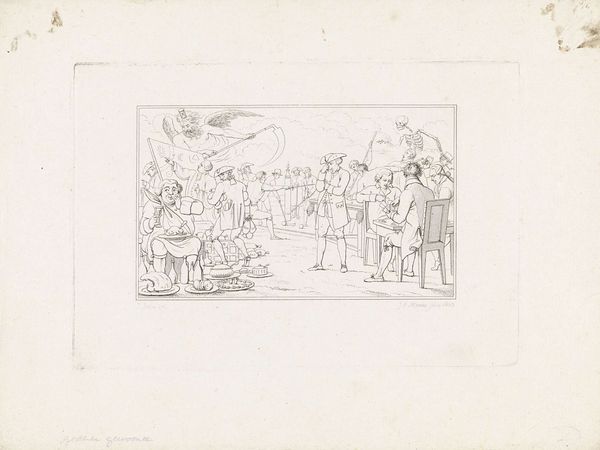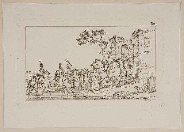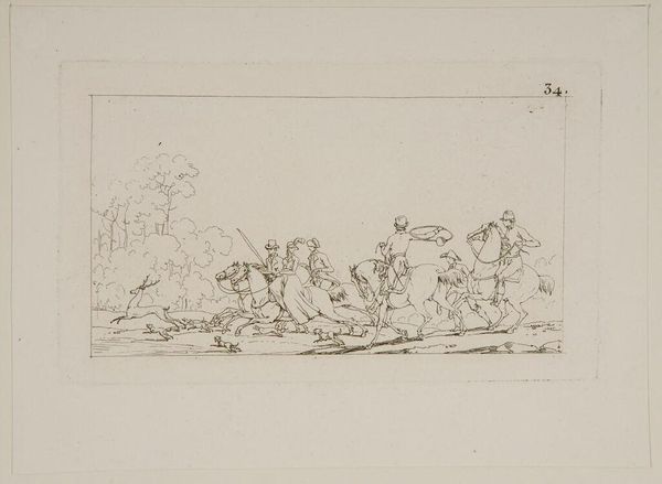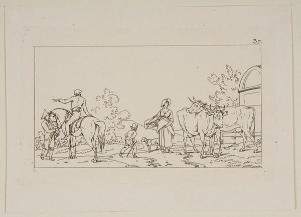 Editor: This is Plate XXXIII by Jacques-Francois-Joseph Swebach, currently held at the Harvard Art Museums. It has a very linear composition, with a clear foreground and background. What are your thoughts? Curator: The composition displays a clear understanding of line and form. Note the delicate lines creating volume and space. How does the interplay of positive and negative space affect your perception? Editor: I think the open space makes the scene feel less claustrophobic and highlights the figures more. Curator: Precisely. The artist uses negative space to emphasize the shapes of the subjects and their interactions within the scene. This careful arrangement guides our eye. Editor: That’s a great point. I will definitely look more closely at how artists use space now.