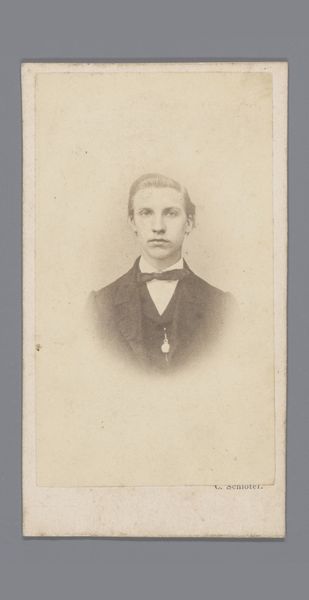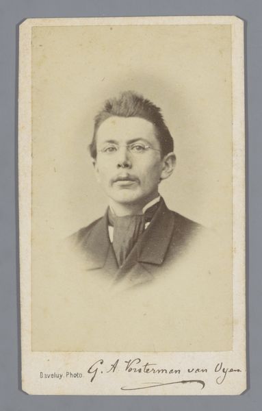 Editor: This is a really interesting object! It's a portrait, likely from the 1880s, by Lodewijk Hendrikus Serré. The museum catalogue says it is possibly a depiction of a grocer in Utrecht. What strikes me is that it's a photograph, but it has this kind of hazy, almost painted quality. What's your read on it? Curator: What fascinates me is the intersection of photographic technology and the aspiration to create a painted effect. This gelatin-silver print, likely touched with watercolor or coloured pencil, speaks to a period when photography was both documenting reality and trying to emulate established art forms. Consider the labor involved; the photographer as a tradesperson, employing chemical processes to capture an image, then potentially adding hand-applied color, bridging the gap between industrial production and individual craft. Editor: So, it’s less about the sitter as an individual and more about photography establishing its legitimacy as an art form? Curator: Precisely! This portrait is a commodity, produced within a burgeoning market of portraiture. The subject's social class, perhaps implied by the suggestion he's a grocer, highlights the accessibility of photography for the middle class. How did this democratization of portraiture reshape social hierarchies and artistic conventions? Editor: That's a perspective I hadn’t considered. So, by examining the materials and process, we understand the photograph's cultural function beyond simply being a likeness. Curator: Indeed. By considering how these photographic portraits circulated and were consumed, we gain insight into the broader social fabric of the late 19th century and the shifting value placed on representation itself. Editor: It makes you think about how we take and share pictures today. I appreciate you focusing on the craft of it all.