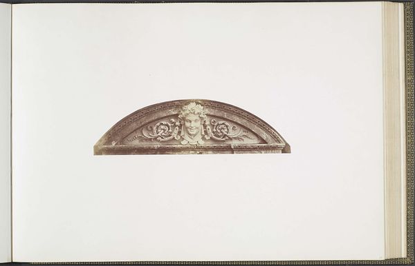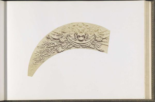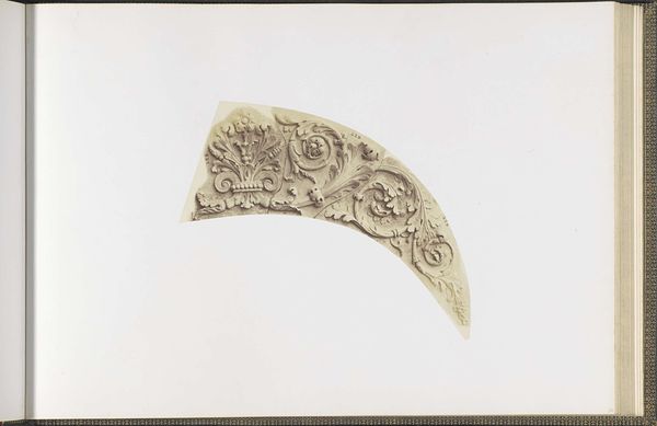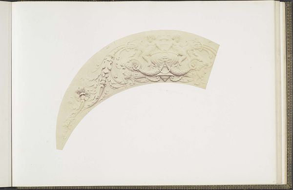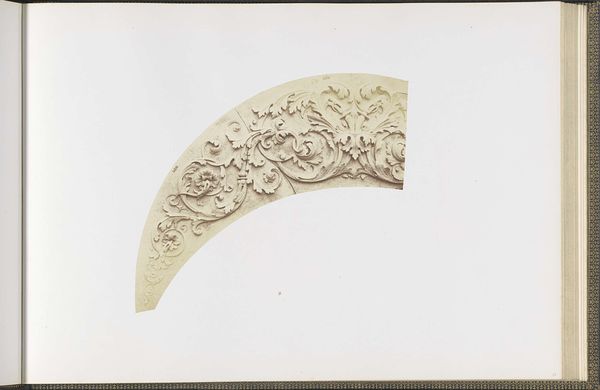 Editor: So, this is an albumen print by Édouard Baldus, taken sometime between 1855 and 1857. It's a photograph of a plaster model for ceiling decorations in the Louvre's Pavillon Richelieu. The details are so intricate! It has this cool, classical vibe... but I'm also struck by the odd shape of the image. What exactly am I looking at? How do you interpret this work? Curator: Ah, Baldus. A master of light and shadow! To me, this fragment speaks volumes. We're not just seeing decoration; we're witnessing the architectural ambitions of Napoleon III's Paris taking form. Look closely – that ornate detailing, it echoes the grandeur of the Roman Empire, a deliberate attempt to link his reign with the glory of antiquity. The photograph isolates this piece, doesn't it? Sets it apart. It’s not just documenting a model, it's almost… glorifying it. Editor: That's interesting, I hadn't thought of it as glorifying. The stark white background really makes the details pop, but it also makes it feel so... isolated, like you said. Was photography a common way to document architectural plans at this time? Curator: Absolutely. But Baldus elevates it. He was commissioned for this, right? He’s not just documenting. Think of the ambition – to capture a piece of the Louvre, a symbol of French power and history. He has rendered it almost weightless! The shadow gives a dramatic feeling. Can you feel that? Editor: Yeah, the high contrast almost makes it seem sculptural itself. I initially missed that layer entirely. Curator: Exactly. What seemed simply "classical" is revealed as part of an important vision. The photograph shows more than the plaster. It gives us light and air, drama and feeling, a sense of monumental vision. The medium reveals it to be simultaneously present and a fragment, simultaneously monumental and manageable. That's what great art, and great art photography, achieves. Editor: This gives me so much to think about when considering historical context and technique.