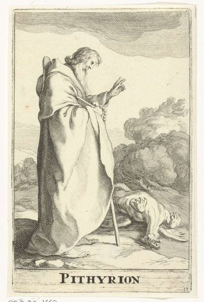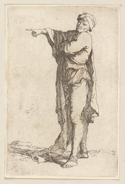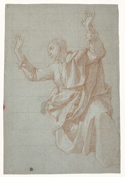 Editor: Here we have Frederick Bloemaert’s "Kneeling Praying Woman (Mary Magdalene?)," an engraving dating from after 1635. I’m immediately struck by the dynamism of the folds in her robe, and the upward thrust of her gaze. What do you see in this piece from a formalist perspective? Curator: I’m drawn to the stark contrasts and the use of line. Notice how Bloemaert employs cross-hatching to build volume and shadow, particularly in the drapery. The texture, created solely through these graphic marks, suggests a weighty fabric. What does the figure/ground relationship communicate to you? Editor: It feels unbalanced; there's so much empty space above her. It makes her seem very small, or maybe very alone. Is that a common compositional technique? Curator: The spatial arrangement does create a sense of isolation. The emptiness directs our focus upward, towards the unseen object of her supplication. The contrast of the dense lines creating the figure against the negative space around her reinforces this. Think about the lines themselves, the visual weight and the rhythm they establish within the overall composition. How do they influence the mood? Editor: They seem pretty uniform and tightly packed to give a heavy and sad feeling overall. So, if we remove her possible identity as Mary Magdalene, and think of her instead as merely a collection of graphic elements, we can still glean a great deal of meaning from the artwork? Curator: Precisely. By examining the visual language – line, texture, composition, we unveil layers of meaning, independent of iconographic considerations. A fascinating use of light and dark to portray a universal feeling. Editor: I’ve definitely got a fresh perspective on how formal qualities can influence my interpretation of an artwork. Thank you. Curator: Indeed, it is in understanding the formal language, that we begin to understand the work.