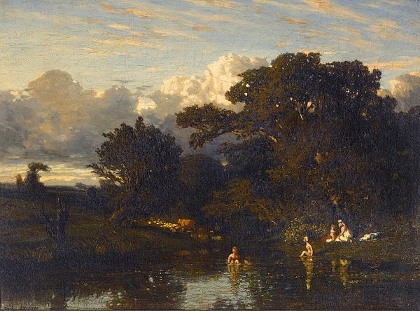 Jules Dupre created The River using oil paints, a traditional fine art material, to capture a landscape scene. Dupre’s application of paint, particularly the varied earth tones and muted greens, reflects a direct engagement with the landscape, one filtered through personal feeling. The brushstrokes themselves are loose and expressive. Note the sky, seemingly brushed and blurred together with shades of gray and white, almost as if to capture a fleeting impression of the scene. The ways in which Dupre used painterly techniques allowed him to express not just the visual appearance of the landscape, but also its atmosphere and emotional resonance. The act of painting ‘en plein air,’ or outdoors, was not merely about representation. It signaled a shift towards valuing direct sensory experience and individual interpretation, breaking from the more academic and idealized depictions of the past. As such, this work stands as an example of how art can reflect and shape our relationship with the world around us.