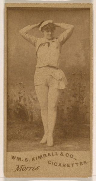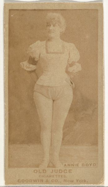 This is Card 282, a lithograph from the Actors and Actresses series, made by Allen & Ginter for Virginia Brights Cigarettes. The sepia tone gives the card a nostalgic, almost dreamlike quality. The subject, Louise Montague, stands with her arms crossed, her posture suggesting a mix of defiance and vulnerability. The composition is rigidly structured; horizontal lines define the base, while Montague’s figure creates a vertical emphasis, dividing the space. The flat, uniform color denies depth, emphasizing the surface and the flatness of the image. The stark simplicity invites us to consider the semiotics of representation at play. As a commercial artifact, the card presents Montague as a sign – she is both an individual and a symbol of aspiration, packaged for consumption alongside cigarettes. The interplay between public image and private identity destabilizes traditional notions of celebrity and value. Consider how the formal elements—the limited palette, rigid composition, and shallow space—contribute to a reading of the card as a cultural artifact, reflecting and shaping societal perceptions of beauty, fame, and commodification.