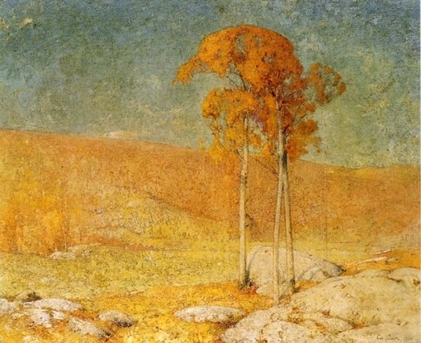 Editor: We're looking at Emil Carlsen's "Spring Landscape," painted in 1904. The oil paint, or perhaps watercolor, gives it such a soft, dreamy quality. It feels incredibly serene, almost like a memory. What stands out to you? Curator: It reminds me of staring out the window on a drizzly spring morning, when the world feels hushed and expectant. Carlsen wasn’t just painting a landscape, was he? He was capturing a mood. Look at how he layered those blues and whites – like trying to hold onto the fleeting scent of blossoms on the wind. Don’t you think he understood the transient nature of spring and really life? Editor: Absolutely! I love how the trees seem to be draped in light, yet there's a certain melancholy too. Do you think that comes from his use of a muted palette? Curator: Perhaps. The pale tones definitely contribute to that feeling, but it also has to do with the way the light diffuses – blurring the lines between the objects, the scene itself becomes the subject, so we are experiencing his vision in every dab and stroke, you know? Editor: That makes so much sense. It's almost as if he's inviting us into his own personal experience of the landscape. It is very beautiful! Curator: Precisely! And perhaps it invites each of us into remembering our own landscape that means the most to us. After all, isn’t art most meaningful when it becomes personal? Editor: Yes, I definitely feel connected to that mood and thought process that Emil Carlsen wanted us to dive into. Thanks for your thoughts!