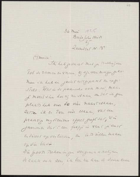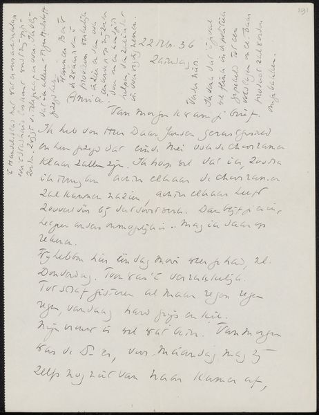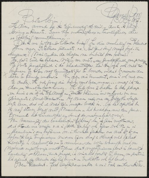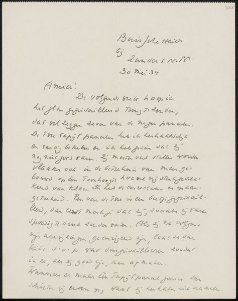 Curator: Let's turn our attention to this rather unusual piece: "Brief aan Ina van Eibergen Santhagens-Waller" by Richard Nicolaüs Roland Holst, created in 1936. It’s currently held at the Rijksmuseum. Editor: My initial feeling is somber. It feels intimate, private almost, a glimpse into a world of thoughtful contemplation. The density of the handwriting makes it feel weighty. Curator: It’s more than just handwriting. Look at the hand-lettering, almost a hand-drawn typeface. This letter is a potent expression of Holst’s political views and, importantly, the sociopolitical climate of the 1930s. We need to ask what this letter reveals about resistance and communication during that time. Editor: You're right, there's a distinct aesthetic to it, that echoes styles reminiscent of old engravings, combined with elements of a personal sketchbook. All these swirling pen marks hold a certain visual poetry, creating layers of meaning through the act of inscription. One senses a world where visual rhetoric really matters. Curator: Exactly! Think about it as a carefully crafted missive. Even the very act of personal correspondence carries weight within historical structures of power and privilege. This wasn't just a note; it was an articulation of a world view against the backdrop of rising fascism. Editor: There's a melancholic beauty here. The ink on paper embodies human thoughts and intentions distilled into visible symbols. One can imagine the emotional resonance this letter held. The overall impression reflects the vulnerability inherent in human communication but also its lasting cultural and historical presence. Curator: It speaks volumes, even now, about the artist’s resistance and solidarity with figures like Ina. By looking closer, we unlock how these individuals navigate a changing world in relation to both interpersonal politics and much wider systems of societal shift. Editor: This work offers a rare opportunity to consider communication and the preservation of culture within the written image. It invites reflection on those past lives intertwined in a shared destiny and leaves one feeling contemplative long after one moves on to the next piece. Curator: Indeed, this single page gives us an introspective look into the convergence of art, political engagement, and the delicate nuances of a relationship amidst historical shifts.