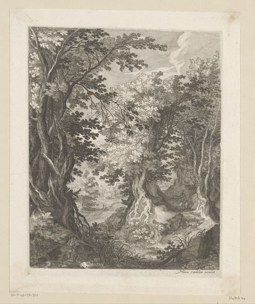 Curator: Charles Jacque's "Dessous de bois à Noisy," created around 1860 to 1864, presents us with an intriguing landscape rendered through the medium of etching. It's currently held in the Städel Museum. Editor: This is striking! It feels so immersive, as if you could just step right onto that sun-dappled path. It almost has a secret, storybook vibe to it, don't you think? Curator: Indeed. Notice how Jacque masterfully manipulates light and shadow. The dense foliage, achieved through intricate linework, creates a complex interplay of tonal values. This serves to both obscure and reveal, drawing the eye deeper into the composition. Editor: The contrast really grabs you. The starkness between the foreground, shrouded in those intricate, dark details, and that glimmer of bright clearing at the center—it's almost like hope filtering through chaos. Am I reading too much into a forest path here? Curator: Not at all! It speaks to a tenet of Romanticism. Jacque is invoking an emotional response through his detailed observation and his compositional technique. Observe also, how the pathway directs your eye using linear perspective, creating depth, but, more significantly, acting as a compositional armature. Editor: It really does. It leads you right into the unknown. And yet there’s something so inviting about it all—the play of light on the path, the implication of further scenery concealed just beyond view. Curator: We can certainly interpret it that way, yes. Consider as well the textures conjured using etching techniques—a method involving the use of acid to cut into the metal plate, allowing for fine lines and dense cross-hatching, evident here. Editor: You know, staring at this intricate web of lines, I keep thinking how much nature is about patterns, about hidden structures. Jacque really managed to get at the beautiful order within seeming wildness. It is quite compelling to observe that quality throughout this print. Curator: It reflects the artistic preoccupations of the period, to accurately depict not just visual reality but its emotional equivalent—and in a manner faithful to material processes. Editor: And he has done that expertly, wouldn’t you agree? Curator: Absolutely, I see the Romantic sentiment vividly evoked by the hand of Charles Jacque. Editor: This piece invites one to stroll, to linger, to become immersed. Bravo, Monsieur Jacque.