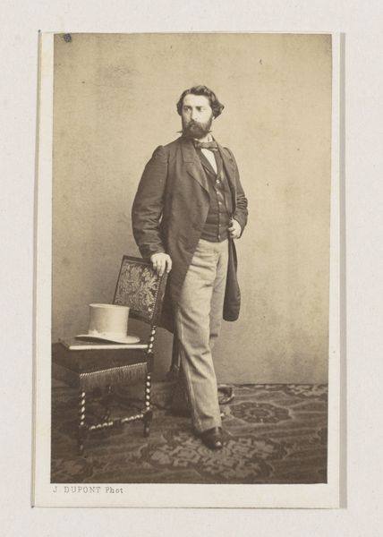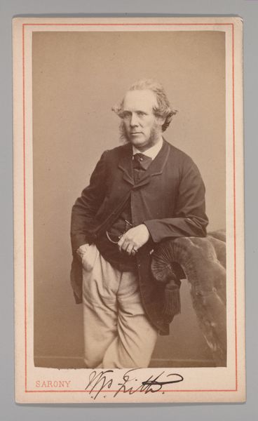 Curator: This albumen print from the 1860s, titled simply "[John Leech]", offers a window into the world of its sitter, an Englishman of considerable stature it seems. Editor: A dignified portrait, almost melancholic. The soft focus lends a certain romantic aura, despite the stern expression of the man. His cane, the meticulously draped fabric, even the sculpture behind him – it all feels weighty, symbolically rich. Curator: Note the placement and quality of the light. These choices and limitations related to the photographic medium itself were paramount to any artistic rendering from this time. Editor: Absolutely. And observe how carefully Leech has constructed his identity, layering meaning through objects: a miniature Greek sculpture to his left; a richly ornamented table. What story are these elements telling? It whispers of artistic sensitivity and erudition, a clear connection to the classical world. Curator: I see that, but can't help but consider the industrial processes at play. From the mass-produced albumen paper to the emerging technologies, the circulation of these photographs democratized portraiture. Suddenly, this level of detailed commemoration was accessible to more than just the wealthy elite. Editor: Democratization, perhaps, but consider the symbolism inherent in photography at this time. The ability to "capture" an image carried its own psychological weight, linked with ideas about memory and immortality. This isn’t just a document, but an intentional construction of the sitter's persona for posterity, imbued with both reality and symbolism. Curator: But even the sitter's own presentation has a material aspect to it! I'd point to Leech's clothing. Note the well-tailored suit – and how even that clothing was increasingly mass produced and accessible through industrial processes, even if here it is very elegant and possibly bespoke! Editor: Well, it gives us much to consider! From materials and production to how even in photography we interpret how visual symbolism serves human understanding across centuries, it feels timeless. Curator: Indeed. It illustrates so many facets of this era in transition through material change.
