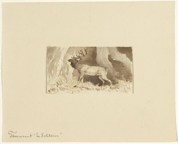 Editor: We’re looking at "In 't Bosch," an etching from somewhere between 1840 and 1870, by Johannes Tavenraat, currently at the Rijksmuseum. There's such a sense of movement here. It’s mostly sepia tones, with this starkly highlighted stag bursting across the frame. What captures your attention most about the composition? Curator: It’s intriguing how Tavenraat uses the stark contrast between light and shadow to create not just movement, but a sense of urgency. The stag itself isn’t merely running; the high key of the figure with those linear hatching details give its form a sense of existing “outside” the tonal range, of *belonging* somewhere else entirely. The diagonal placement across the frame certainly adds to that kinetic energy. Do you see how the foreground and background essentially merge, creating a rather shallow space? Editor: Yes, it's like the forest is closing in on the stag! Is that lack of depth intentional? Curator: Precisely! This collapsing of space pushes the stag forward, toward the viewer, heightening the immediacy and the inherent tension of the scene. Consider also the economy of line—Tavenraat masterfully suggests form with minimal strokes. Editor: So, the emotional impact comes directly from how he manipulates those basic artistic elements. Curator: Precisely. The mood isn't simply *of* the forest. It *is* the structural framework upon which the forest *and* the stag are presented. Tavenraat uses formal techniques to suggest the ungraspable sublime—how that terror reflects in a subject trying to escape from its surrounding. It reminds us that an artist's vision is often how skillfully formal cues affect a subject's psychology. Editor: That really gives me a different way of looking at it. Thanks for pointing out how those techniques build the emotion!