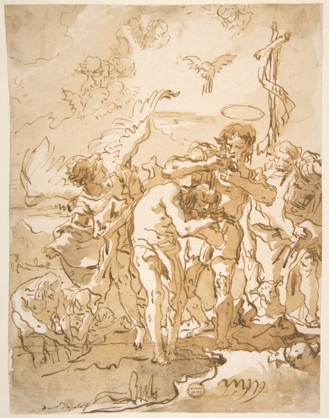 Luca Giordano created this drawing, Saint John the Baptist Preaching, using pen and brown ink with brown wash. John the Baptist stands as a commanding figure, his raised hand a beacon, drawing attention to the heavens. This gesture transcends mere oration; it echoes through centuries, recalling ancient invocations to deities and pronouncements of prophets. Consider the raised hand - a motif found in Egyptian art, signifying power, and in classical oratory, emphasizing truth. Yet, here, it is imbued with a fervent spiritual intensity, an echo of the divine mandate. This is not simply a man speaking, but a vessel delivering a message of urgent importance. The emotional weight of this image lies in its appeal to collective memory, stirring deep-seated human desires for redemption and guidance. This symbol, much like the cyclical nature of history itself, resurfaces, evolves, and takes on new meanings, engaging viewers on a subconscious level.