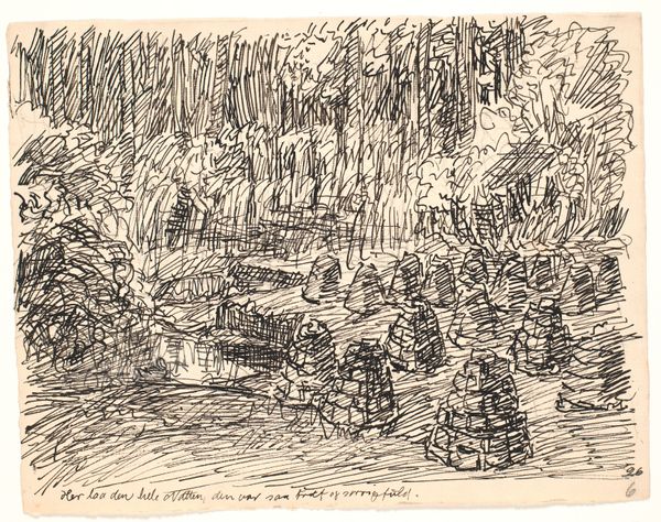 Curator: Allow me to introduce you to Peter Hansen’s "Pergola i Pompeji," a drawing created between 1902 and 1906. It showcases Hansen's masterful use of ink, pencil, and pen to capture a fleeting impression of a pergola. Editor: It feels like a memory, a half-remembered summer afternoon. The lines are so immediate and raw, almost like the artist sketched it while a gentle breeze rustled through the pergola's leaves. There’s a dreaminess that softens the architecture. Curator: Hansen’s impressionistic style here isn't just about aesthetics. He's actively participating in broader cultural dialogues around the meaning of place and experience in the early 20th century, challenging academic traditions and reflecting shifting social values. It brings into question notions of "idyllic" life amid encroaching industrialization. Editor: Absolutely! I see a certain kind of melancholic peace here. It makes me wonder about who sat at those tables under that roughly sketched covering, and about the everyday beauty the artist found worthy enough to record with such spontaneity. It has that imperfect touch that lets our own memories attach. Curator: It also highlights how Hansen employed sketching, typical of plein air painters, to quickly capture impressions that break from established notions of fine art. He utilizes the inherent imperfections and dynamism to reflect a new way of seeing the world around him. Editor: It feels so incredibly current because it bypasses detail and gets right to the ephemeral quality of light, the transient vibe of a gathering, that intangible something. Curator: Precisely, this piece offers an insight into the personal sketchbook practice while pointing to much broader social and artistic shifts. Editor: Makes you wish you were there, doesn’t it? Though, maybe better to exist just as a drawing—eternally summer-like, never burdened by mosquitoes or awkward small talk.