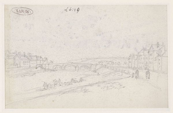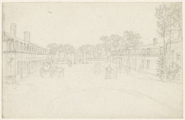 Curator: Before us, we have Georges Michel’s “Weg aan de rand van de stad,” created sometime between 1773 and 1843. The work, a plein-air drawing, employs both pencil and pen and ink. Editor: It feels like a memory, fading at the edges. Kind of wistful, you know? A quiet road, maybe a little lonely. The sketchy quality adds to that feeling, like it’s more impression than reality. Curator: The aged paper substrate becomes integral to the work. Observe how it enhances the sense of temporality. The medium is essential to grasping the art historical context. Michel positions himself firmly within Romanticism's exploration of emotion and nature. Editor: True. But also, there’s something almost rebellious in its simplicity. All those grandiose Romantic landscapes, and then you get this… tiny, unassuming sketch. Like, “Yeah, nature’s great, but what about the bit just outside town?” I like that contrast. Curator: The formal aspects also support this subversion. Note how the lines, though delicate, delineate space—how they generate spatial logic using structural arrangements. Editor: Those sketch lines—they really get the imagination going. You almost feel like you could add to it yourself, complete the picture, fill in the story. It’s very…inviting, in a way that a polished landscape sometimes isn't. Curator: And consider how the technique—rapid, assured strokes—suggests not merely depiction, but analysis, conveying transient atmospheric conditions. There’s even a pre-Impressionist sensibility, avant la lettre. Editor: So, a glimpse into a fleeting moment then, caught on paper. A moment on the edge of town that asks to consider the overlooked and question the spectacle. That’s powerful, in its own small way. Curator: Indeed, the material construction itself creates this sensation. We leave with new questions, rather than answers. Editor: Makes you want to grab your sketchbook and find your own edge of town, doesn't it? See what stories are waiting there.