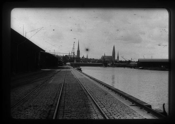 Curator: This photograph, attributed to Laurence Feininger, is titled "Tracks by water in Lübeck". Its diminutive scale, only 2.5 by 3.5 centimeters, focuses the eye intently. What strikes you first? Editor: The stark contrast! The geometry of the tracks cutting through such oppressive darkness creates a deep sense of foreboding. The light seems almost spectral. Curator: Indeed. The high contrast emphasizes the textures, the cobblestones, the railway lines. It's almost a study in linear perspective, drawing us into the scene. The architecture of Lubeck is a city that joined the Nazi party early, a city with seven steeples that held relics, with a complex relationship with Catholicism, a place with its own historical narrative. Editor: It's a potent visual representation of industrial space, almost a film noir setting before its time. I wonder about the socio-economic implications of this industrial scene, of labor, and of urban progress in the early 20th century? Curator: A keen observation. Thinking about the formal qualities alongside that context enriches the photograph. Thank you for your perspective. Editor: And thank you. I'll be thinking about those spectral tracks for some time.