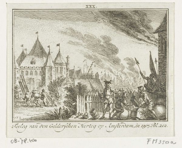 Albert Flamen created this print called 'View of Gentilly' with engraving sometime in the 17th century. The crisp lines and stark contrast immediately draw our eye to the image's meticulous detail. Notice how the composition is structured around a central building, flanked by open fields and wooded areas. Flamen uses linear perspective to create depth, guiding our gaze from the foreground figures engaged in a hunt towards the distant, rolling hills. This technique not only provides a sense of spatial recession but also invites us to contemplate the relationship between human activity and the natural world. The engraving's formal qualities reflect the prevailing interest in naturalism and landscape during the period, yet, it also challenges fixed meanings. The scene suggests a complex interplay between leisure, nature, and social hierarchy. As viewers, we're encouraged to question the values and power structures embedded within such idyllic representations.