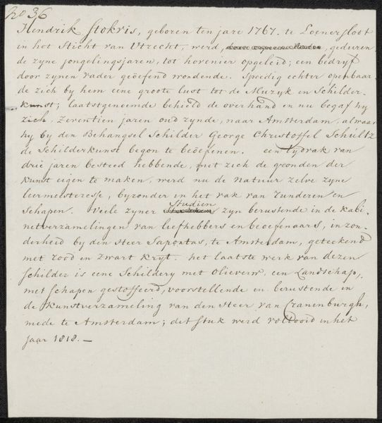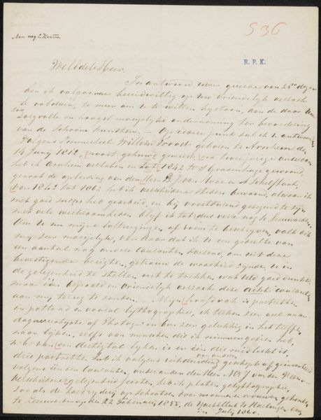 Editor: Here we have "Brief aan Christiaan Kramm," possibly from 1845, a drawing by Marinus Jacobus Stucki using ink on paper. My initial impression is that it's densely packed, almost claustrophobic. What strikes you about this piece? Curator: The dense and seemingly disorganized nature of the text presents an intriguing formal puzzle. Let us consider the calligraphic lines as form. Notice how they create patterns on the page. Is there a rhythmic quality despite the absence of distinct sections or visual breaks? What about the tonal variations in the ink itself? Does it contribute to depth, texture, or a sense of movement? Editor: I do see the patterns and the way the darkness of the ink contrasts with the paper. But it's difficult to engage with as art; it just looks like a letter. Are we meant to consider the content too, even though I can't read it? Curator: Not necessarily. Formalism seeks to extract meaning from the visual experience alone. We might analyze the letter’s composition irrespective of its linguistic meaning, viewing it primarily as a field of graphic marks, balanced and counterbalanced. How does this approach affect your experience? Editor: I suppose it makes me appreciate the craftsmanship, the way the artist controlled the pen to create such uniform lines. I hadn't thought of that before. It almost abstracts the personal element away, right? Curator: Precisely. It reframes our engagement, focusing attention on the aesthetic qualities of the artifact rather than its narrative function or cultural moment. The letter’s function transforms, from communication to an exploration of form itself. Editor: That's a very different way of approaching art! I’ll have to keep an open mind and really concentrate on *seeing*. Curator: Indeed, close seeing can open unexpected pathways into appreciating artwork from diverse periods and backgrounds.
