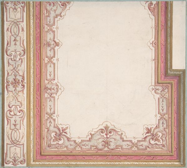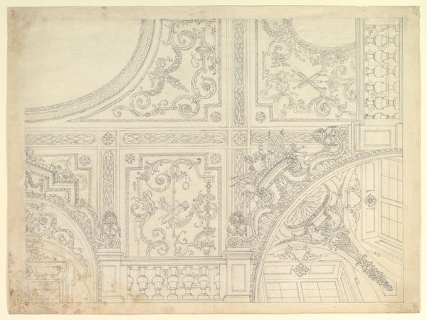 Jules-Edmond-Charles Lachaise made this design for half of a ceiling decoration in Fontainebleau, France, using graphite, pen and brown ink, and brown wash. This drawing offers insight into the world of French decorative arts, likely during the early 20th century. We can see the precise planning required for ornamentation within elite spaces. The drawing itself would have been part of a complex process involving architects, designers, and artisans, all working within a hierarchical system to create environments of luxury. The visual codes, from the symmetry to the classical motifs, speak to a desire for order, balance, and a connection to the grandeur of the past. It might be fruitful to research the patronage system in France at this time. How did the state or private individuals commission such works, and what did these spaces signify in terms of social status and power? By delving into archival documents, such as artists' contracts, estate inventories, and architectural plans, we gain a much deeper understanding of the social and institutional forces that shaped this design.