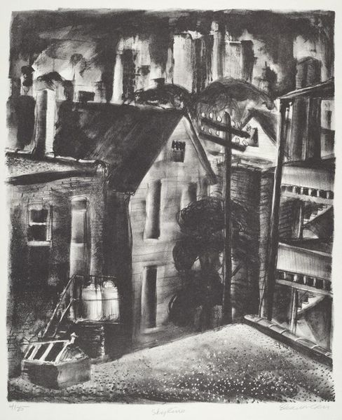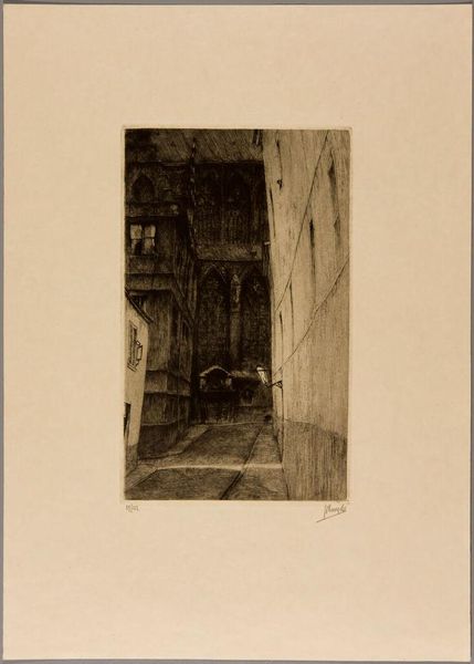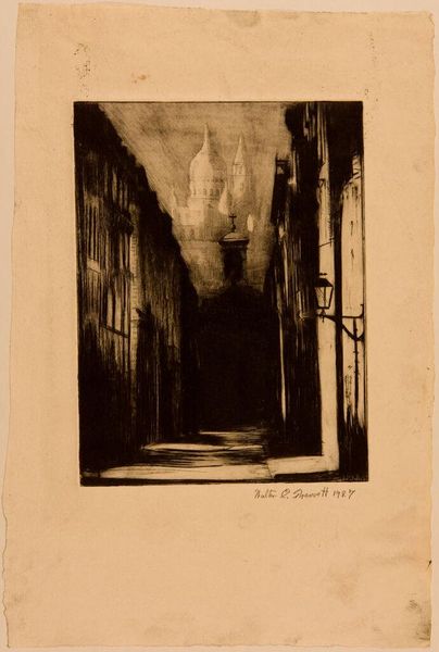 Curator: This is "Little Penthouse" by Martin Lewis. What strikes you first? Editor: It's a mood piece, definitely. Lonely, almost Hopper-esque with the figure framed by the window. The darkness is overwhelming. Curator: Lewis was deeply interested in capturing urban life, especially the experiences of those often overlooked. He lived from 1881 to 1962. Editor: I see a woman, perhaps working class given the setting, almost trapped. The "penthouse" irony is sharp. What are we saying about who belongs where? Curator: The etching captures the stark realities of urban living. The stark light suggests surveillance, doesn't it? Editor: Absolutely. The gaze, the unseen observer... it speaks to power, gender, and the vulnerability of existing within a system built against you. Curator: It prompts reflection, doesn't it? On the unseen lives shaping our cities. Editor: Indeed. A reminder that every space holds layered narratives waiting to be uncovered.