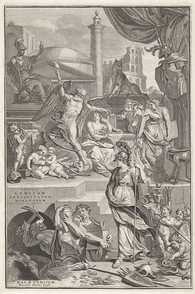 Editor: We’re looking at “Title Page Design with the Triumph of the Art of Painting,” an engraving by Bernard Picart, dating back to around 1725. It’s incredibly detailed. I’m struck by the sheer number of figures depicted. It feels…theatrical, almost propagandistic. What do you make of it? Curator: It's a fascinating piece to consider, especially through the lens of power structures and representation. Look at how Painting, often personified as a woman, is being crowned and validated by other allegorical figures. Who benefits from this 'triumph,' and whose voices are potentially silenced or marginalized in this representation? Consider the socio-political context of the 18th century and how art served to legitimize certain narratives. Editor: That’s interesting. It seems like a straightforward celebration, but you're suggesting there’s a more critical reading to be had. The muscular, almost writhing figures at the bottom – are they representative of suppressed voices? Curator: Perhaps. Think about what kinds of bodies and stories are absent or relegated to the margins in mainstream art historical narratives. How does the glorification of ‘high art,’ often associated with the elite, contribute to the devaluation of other forms of creative expression or cultural traditions? Is there something subversive within what looks at first as idealised or are we just replicating traditional readings by ignoring gendered narratives. Editor: So, you are proposing this image needs re-evaluation through the issues of class and privilege… That hadn't occurred to me initially. Curator: Exactly! Considering gender, class, and cultural background. Are we implicitly complicit when engaging uncritically with artworks like this, within contemporary political contexts? Editor: I see. It's like understanding not just what the image *is,* but what it *does,* and who it serves. This helps to broaden the narrative to social concerns. Curator: Precisely. Hopefully we can view older works not only through how we perceive their technical artistry, but also how we approach history. Editor: Absolutely! Thanks. I'll consider this perspective.