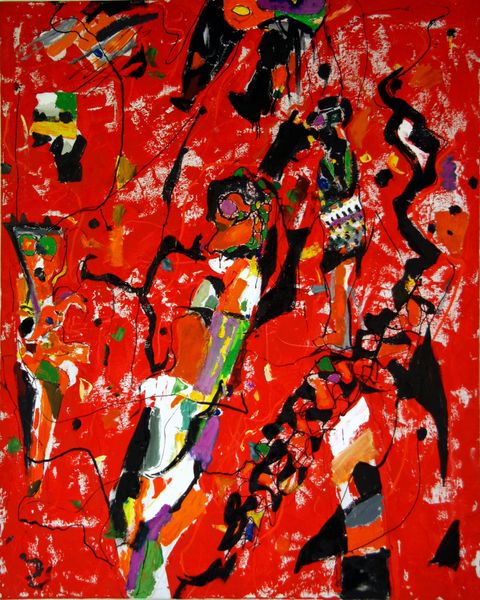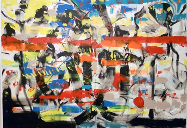 Curator: Romul Nutiu's "Illumination" from 2010. It’s an acrylic on canvas work. My initial response is just how...bright...it feels, despite those shadowy areas. Editor: Yes, that overarching sense of light dominates, doesn't it? The composition strikes me as intentionally disruptive. That intense yellow...it feels like the sun exploding, but contained. Curator: Contained, yes, I think so. It's expressionist, teetering towards abstract expressionism in its use of pure colour and gestural marks, which serves as the signifier. Editor: Exactly, there’s a controlled chaos to the brushstrokes. It feels almost like Fauvism at play with that boldness. But tell me, do you see a landscape hinted at here? I see almost a horizon line. Curator: I agree on that point. Observe the bold, blue horizontal slash—its placement suggests a landscape receding into the distance. Notice how the chromatic intensity in the foreground shifts. Editor: Ah, the "slash." A harsh, simple element in a complex scene. The colours sort of grind against each other, and I like it. Are there other landscape paintings in his oeuvre? I almost feel I should recognize him. Curator: Nutiu’s style incorporates elements of neo-expressionism. I can certainly find further biographical information for you. But observe now how light functions not only as a subject but also as a structural component. The darker hues push the foreground forward, emphasizing depth in tension with flatness. Editor: Okay, point taken! It’s fighting with itself – very alive. It has got me thinking, does the artist view “illumination” as a destructive or generative act here? Or both? I am drawn to how Nutiu balances abstraction and just a hint of form, it lets my imagination get away with itself. Curator: An excellent query. I would assert Nutiu utilizes formal contradictions. He compels us to reconsider binaries inherent within both abstraction and representation as categories themselves. Editor: It feels less of a statement, then, and more of a probing question...about the very nature of seeing, maybe? I could sit with this for ages. Curator: Indeed. "Illumination," for all its chromatic vigor, withholds easy answers, offering instead an experience predicated on sustained looking, which as we can gather, opens numerous interpretative portals.