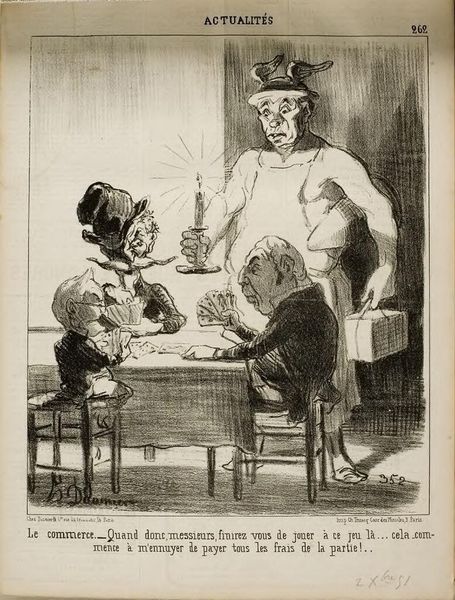 Curator: Right, let's talk about this Honoré Daumier print, titled "Voila bien des oeufs de cassés…" or, roughly translated, "So many eggs broken...". It dates back to 1866. Editor: Well, isn't that an understatement! There are eggs EVERYWHERE! It’s utter chaos. Looks like somebody’s had a real culinary disaster. Or perhaps something more... explosive? Curator: That's the beauty of Daumier's work. It looks like a kitchen scene, but it's a sly political jab. The central figure with the pointy helmet... clearly a Bismarck caricature attempting, rather clumsily, to cook up an omelette. The other fellow appears to be a befuddled civilian watching the scene with detached concern. Editor: So the broken eggs symbolize failed political maneuvers, shattered alliances perhaps? The smoke makes it hard to read the expressions on their faces… a deliberate ambiguity? It's like a comic strip with a really dark punchline lurking underneath. Curator: Exactly. Daumier, through realism laced with biting caricature, critiques the Prussian power plays in the lead up to the Austro-Prussian War. Note the heavy reliance on lithography; Daumier was able to circulate these widely as journalistic social critique. The man smoking is observing the chef struggling, perhaps standing for Europe’s reaction at large? Editor: I see… so what seems like a kitchen farce is actually a sardonic commentary on the messiness and collateral damage of power politics. That shifts my perception of that pile of eggs. What seemed absurd a moment ago becomes a bit menacing. Food always becomes potent as political commentary... don’t you think? Curator: Yes, it reminds us how enduring symbols can be. That humble egg yolk, easily shattered, takes on enormous political weight! I find it fascinating how Daumier compresses layers of social and political critique in such a deceptively simple scene. Editor: And the broken shells leave a mess, much like the lingering impact of geopolitical fiascoes. Quite thought provoking. Curator: Indeed. Now you mention food as political fodder, this image provides much food for thought, I reckon.