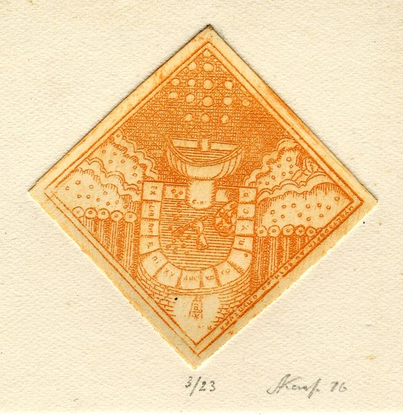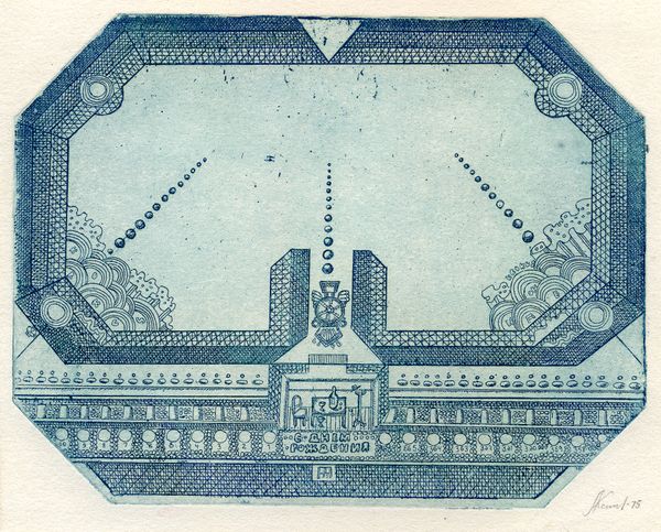 Editor: This is “Exlibris of Zvir.O.” made in 1976 by Oleksandr Aksinin, it’s an engraving. It looks like some kind of surreal scene, and there are a lot of figures packed into the frame. How do you interpret this work? Curator: Well, consider the title "Exlibris," meaning "from the books of." This small print was created to be pasted inside a book as a mark of ownership, so what could Aksinin be implying about the book owner? Editor: Hmm… ownership. Maybe the figures crowded at the top are all the ideas contained within the books, trying to get out? Curator: That's an interesting start. Notice how the image is split into sections. At the top, we see those crowded figures – perhaps representing a collective consciousness or shared knowledge. And beneath that, there is an opening to a prison like place? Editor: It looks like a structure with ladders and what appears to be a figure crawling beneath, next to the words “Exlibris”. And, oh, below, there's a walled section, almost like an entrance or a foundation, it looks flooded… What do you make of the ladders? Curator: Ladders often symbolize a bridge between realms, a connection between the conscious and unconscious. The well, the figures at the top…It suggests a descent into the self, or maybe even into history, don't you think? Perhaps the collector’s interest allows them access to a historical or subconscious experience? Editor: So, owning the book provides access. I’m still stuck on the figure beneath, however, he seems to have nowhere to climb, stuck with no opportunity to get out of the… well. Curator: Perhaps Aksinin questions our relationship to knowledge. Are we truly ascending through enlightenment, or are we just crawling through pre-determined constructs? Editor: That's a darker way to interpret it. I hadn’t considered it could be a more cynical observation on knowledge. Thanks for highlighting those visual cues.
