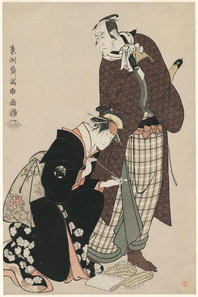 Curator: What strikes me immediately is the sheer physicality depicted here. We're looking at "Ichikawa Komazō III in the Role of Kameō with Iwai Kumesaburō in the Role of Kameō's Wife, Oyasu, from the Play Shunkan futatsu omokage," a woodblock print by Utagawa Toyokuni I, dating from 1798-1799. The figure wielding the hammer! It practically vibrates off the page. Editor: The imagery does indeed jump out. There's the symbolism of the teacup that the wife offers and how it relates to domestic tranquility alongside hard labor. Even the color palettes—the earthy browns against the bolder red—seem laden with meaning. What can you tell me about the actual printmaking process? Curator: Ukiyo-e prints were very much a collaborative effort. Artists designed the image, but skilled block cutters and printers were vital in translating that design. The choice of wood, the precision of the carving, and the layering of pigments – all dictated the final product and, thus, our interpretation. The red, for example, might have been achieved using a dye derived from safflower, a costly and prized material. Editor: And how do these elements tie into the story of the play itself? Because it looks to me like a symbolic tableau of devotion in adversity. He's toiling; she brings him solace in the form of tea. Their roles are rigidly defined, but their expressions also convey something else. Curator: Absolutely! The print collapses specific performances within a longer narrative, preserving memory, or better said memorializing cultural memory. By referencing certain popular narratives and playing on existing aesthetic trends in woodblock production, a feedback loop of meanings were established among the Japanese culture during that time. Editor: So the print is acting almost like an advertisement then. Do you find this example, where we get such emphasis on materials and labor, transcends mere commercial purposes? Curator: Precisely. Consider the dissemination of ukiyo-e prints within the context of Edo period Japan— the growing merchant class, the rise of Kabuki theater, and print culture were integral aspects of cultural production and dissemination. While definitely tied to popular entertainment, prints like these played a key role in shaping tastes and, maybe even solidifying social values. Editor: It enriches my viewing, seeing not just an image, but a reflection of its social circumstances and symbolic context. Curator: Exactly, knowing about materials and how images operate together with stories opens new possibilities to understand the emotional world within visual expressions.