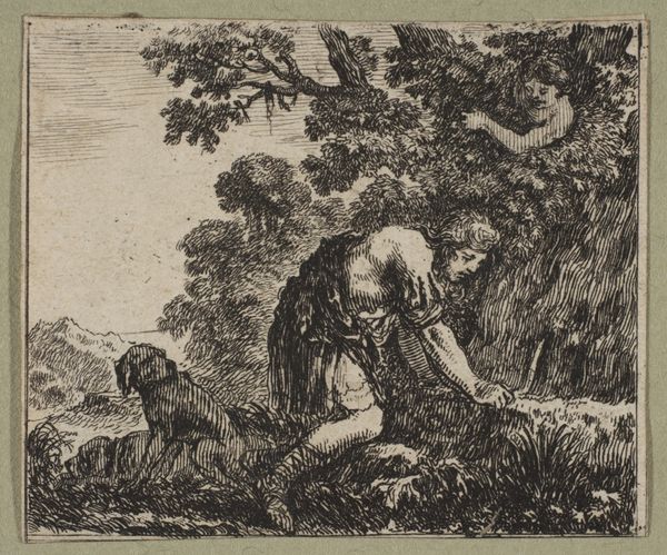 Curator: Here we have Gerard Hoet's "Moses and the Burning Bush," an ink drawing created sometime between 1660 and 1733. Editor: It strikes me as very baroque, a scene of both serenity and dramatic tension, rendered with a delicate touch. The contrast between the angel in swirling drapery and Moses weighed down and barefoot... very powerful. Curator: Indeed, and think about the labor involved in creating this print. The skilled hand meticulously laying down lines to create depth and form. Hoet, a master draftsman, also operated a workshop that produced a considerable amount of drawings and engravings. How might that have shaped his artistic practice, its standardization, and division of labor? Editor: Absolutely. Seeing Moses as the grounding force kneeling, seemingly resistant to this vision of God's calling really captures the feeling of bearing the weight of leadership and societal change during turbulent times. I think about today and the relevance this narrative can bring regarding community involvement and what bearing witness really means when it comes to demanding liberation. Curator: Looking at the materiality, the precise ink lines build not just an image but a tangible record of the engraver’s time and skill, also speaking to print culture's rise and role in disseminating stories and ideas during this period. Were such prints meant for broad distribution, personal devotion, or the collections of wealthy patrons? That has clear implications for both intended audiences and lived realities. Editor: This piece is steeped in layers of history. And it certainly makes me consider the impact that the story of Moses has on diverse cultural identities. From its origins in religious texts to its echoes in liberation movements, we can certainly learn a great deal when deconstructing biblical representation throughout intersectional artistic and historical narratives. Curator: Thinking about Hoet’s methods, the production practices of the era, the division of labor involved in the execution, from the creation of the design to its replication. Editor: The scene, frozen in this drawing, allows us to remember the weight of the past, as well as to use it to look at the present and imagine more equitable futures. Curator: Precisely. Editor: A beautiful dialogue between the sacred and the societal.