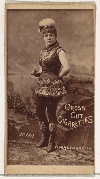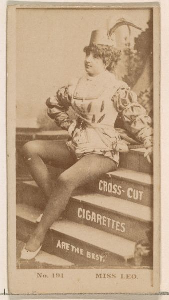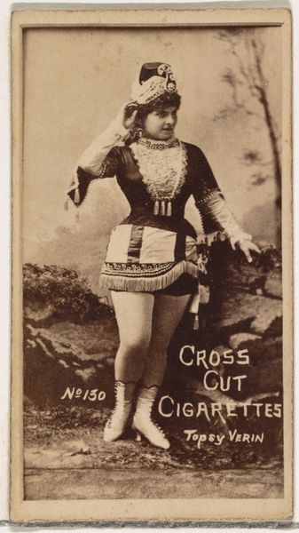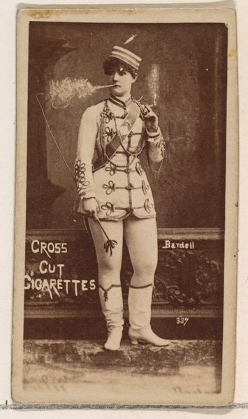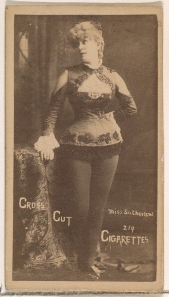 Curator: Welcome! We are now looking at card number 329 of the Actors and Actresses series from the 1880s. The card features Wallace and was issued by Duke Sons & Co. to promote Cross Cut Cigarettes. Editor: My first impression is one of deliberate artifice. It’s designed to entice. The material of that lace and how it falls--it is quite beautiful but definitely placed for our view, to stimulate consumer desire. Curator: Yes, these cards played a vital role in cultivating consumer habits. It speaks volumes that tobacco companies used the symbolic power of female actors, often presented in alluring ways, to create positive associations with their product. Wallace here, partially obscured by that beautiful lace, invokes curiosity and hints at something tantalizingly out of reach. It's a potent psychological game. Editor: I see a distinct intersection of entertainment, advertising, and burgeoning mass culture here. The card itself is a cheaply-made, mass produced item designed to be disposable, but the image is very intentionally constructed for value. What interests me most is this relationship between value assigned versus labor and the resources for mass consumption. How does the accessibility alter the viewers reception? Curator: The inherent tension of mass production versus the individual subject portrayed is significant. The card seeks to elevate Wallace and create allure while existing within a cheap, easily discarded format. Editor: But consider the reverse, that this accessibility gave Wallace notoriety. Were it not for the card and its distribution, it is likely Wallace and Cross Cut Cigarettes would both be forgotten to time. Curator: Good point! The card both diminished and amplified. In its small way, it preserves a moment, a face, and a set of cultural values that are really rich with contradiction. Editor: Yes, there is much to see when digging beneath that lace curtain.