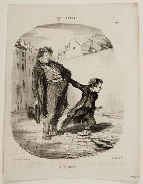Curator: This lithograph by Honoré Daumier, titled "Let's go...let's go, little one, who says he has a tummy-ache!", strikes me as quite poignant. The stark contrasts and hurried lines convey a sense of urgency. Editor: Indeed. The subject matter is really intriguing. Daumier was masterful at depicting the material realities of 19th-century French society, like the burdens and daily dramas of family life for these bourgeois figures. Curator: Precisely! The father's attire versus the implied ailment of the child presents a fascinating material contradiction, doesn't it? How does societal expectation weigh against individual suffering? Editor: It's fascinating how Daumier uses the relatively new medium of lithography to capture and comment on social behaviors and class structures. He's really using art as a mirror to the politics of everyday life. Curator: I find that exploration of societal pressures within the domestic sphere so very relevant, even now. Editor: Yes, it leaves you contemplating who has the real “tummy-ache” in this scenario.