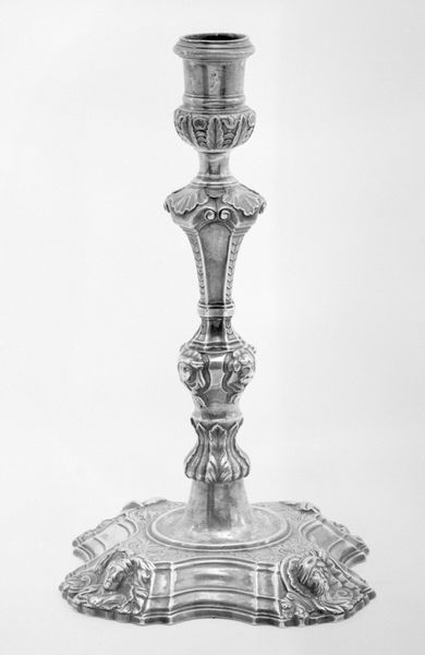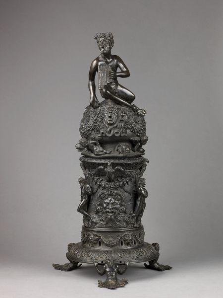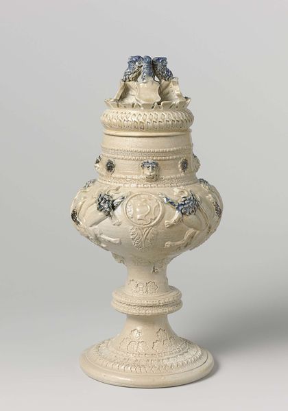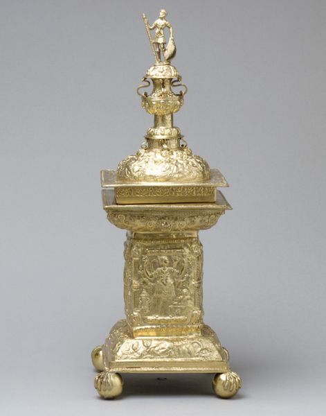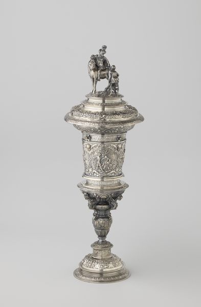 Curator: Oh, my, the sheer density of detail is immediately overwhelming! It almost vibrates with ornate complexity. Editor: Indeed. We’re looking at what's known as the “Masterpiece cup and cover” by Johann Friedrich Baer, crafted in 1746. You can find it here at the Minneapolis Institute of Art. It's a dazzling example of Baroque silver work. Curator: Baroque, absolutely. You see it in that exuberant layering. All that texture created with the carving of silver—what stories do you see emerging from the decoration? Editor: Well, on the cup's base, bacchanalian figures hint at celebration and earthly pleasures. The central portion of the cup seems to depict scenes of mythology perhaps related to triumph and virtue while above that, right there at the top stands a heroic figure, likely Hercules himself, in triumphant pose, club raised, a defeated Cerberus, the hound of Hades, at his feet. Curator: It feels overtly celebratory but the mastery of composition, that tension between density and dynamism – it really draws you in. How does the material itself inform its function in society? Editor: Pieces like this were essentially demonstrations of status and skill. They were meant to impress, displaying wealth, knowledge, and power during elaborate feasts or diplomatic gatherings. Silver, of course, was highly valued, a tangible signifier of affluence, making ownership of such items deeply connected to privilege and social authority. These types of art pieces were statements of wealth and refined taste during the Baroque era. Curator: And Baer, through his technical prowess, really delivers that statement, doesn’t he? The reflections play off those high and low reliefs to make something of striking theatricality, even now. I almost feel I need to be wearing a powdered wig just to properly appreciate it. Editor: (laughs) Perhaps a viewing party is in order. Still, beyond social considerations, Baer has crafted something quite compelling formally. It strikes me as more than just wealth—but artistic expression, even bordering on sculpture, where function becomes secondary. Curator: Precisely! The way meaning and art collide so powerfully and so visibly here tells us as much about society as it does the artist. Editor: A glittering testament, if I may say, to the enduring power of visual spectacle.