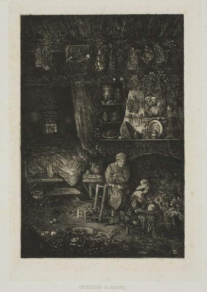 Editor: Here we have Rodolphe Bresdin's "Intérieur flammand," a very detailed print from the 19th century. It feels almost claustrophobic with all the visual information packed into such a small space. What do you see in this piece? Curator: I see a potent commentary on domesticity and social confinement. The density of the interior, almost to the point of being overwhelming, speaks to the limited roles and spaces often assigned to women, particularly within bourgeois society. Do you notice the layering of objects, almost suffocating the figures? Editor: Yes, it's hard to ignore. It’s as if the objects themselves are pressing down on the women. Curator: Exactly! Consider how this imagery reflects the broader socio-political context of 19th-century Europe, where women's identities were often defined by their domestic roles. The print becomes a critical reflection, perhaps even a subtle act of resistance, against these constraints. Editor: That's a perspective I hadn't considered before. I was focused on the visual complexity, but now I see the social commentary too. Curator: Art is always speaking to something, isn’t it?