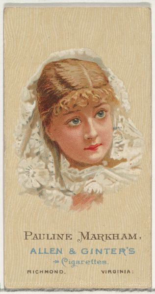 This is a chromolithograph of Vernona Jarbeau, from World's Beauties, Series 2 (N27) for Allen & Ginter Cigarettes. The composition is strikingly simple: a head-and-shoulders portrait set against a neutral backdrop. The eye is drawn to the subject's face, framed by soft, curling hair that cascades around her visage. The delicate balance of light and shadow gives the image a three-dimensional quality, enhancing its sense of realism. The formal construction of this portrait also hints at larger cultural codes at play. The subtle use of color – a muted palette of creams, pinks, and browns – evokes a sense of refinement and elegance, reinforcing the subject's status as one of the “World's Beauties.” It challenges fixed meanings in a sense, through the use of beauty to sell a commercial product. Ultimately, the artwork’s formal qualities underscore its function within a complex semiotic system, one where beauty, commerce, and representation intersect. The image exists as both a depiction of an individual and a signifier of broader social values.