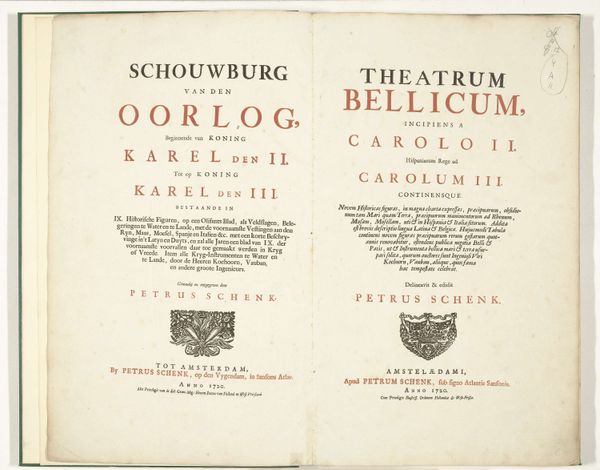 This is the title page of “Schouwtoneel van den Oorlog,” or "Theatre of War," printed in Amsterdam in the 1700s by Jan Roman. The composition is dominated by a hierarchy of text, meticulously arranged, with the title words "Oorlog" and "Schouwtoneel" enlarged and printed in a striking red ink. The use of typography creates a visual structure that guides the viewer's eye, moving from the grand announcement of war down to the specifics of King Karel the Second and the historical figures involved. This carefully structured layout, with its variations in font size and color, aims to convey a sense of order amidst the chaos of war. The page serves not just as an introduction but as a carefully constructed semiotic space. Note how the choice of a theatrical metaphor, ‘Schouwtoneel’, presents war as a spectacle. The title page invites us to consider how war is framed, understood, and consumed as a form of cultural representation.