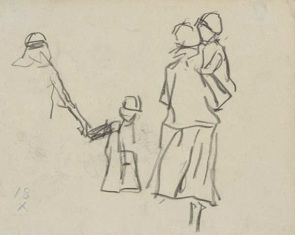Curator: This is a pencil sketch by John Varley entitled "A Woman, and a Boy Carrying a Child", found within the Tate Collections. Editor: It's so delicate, isn't it? There's a lightness to the figures, almost ethereal, even though they seem weighted by their circumstances. Curator: Varley's societal observations are often quite poignant. Considering his era, his work provides a window into the lives of marginalized figures, particularly women and children. It brings up questions about labor, care, and the burdens placed on the young. Editor: The figures have an almost sculptural presence in the way Varley uses shadow to define their forms. The composition's subtle asymmetry creates a visual tension. It prevents the scene from feeling too sentimental. Curator: Absolutely, and the lack of detail in their faces encourages us to project our own narratives onto them, highlighting the universal themes of resilience and familial bonds. Editor: I'm struck by how Varley managed to convey so much with so little, using just a few lines to evoke a whole world of feeling. Curator: It reminds us to consider the narratives embedded within art, and the importance of historical and social context.