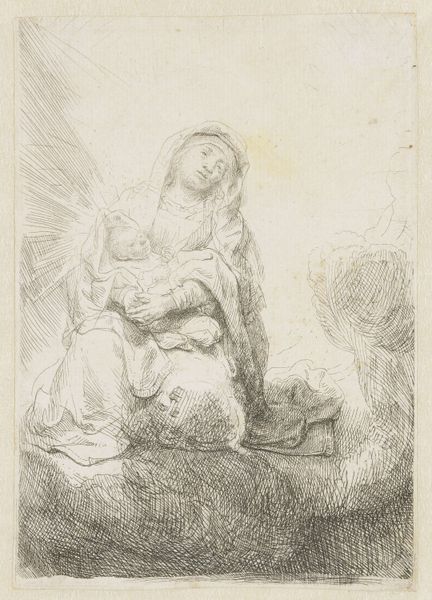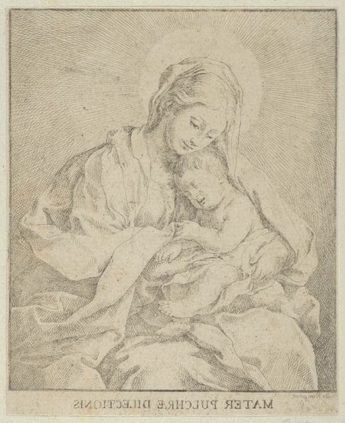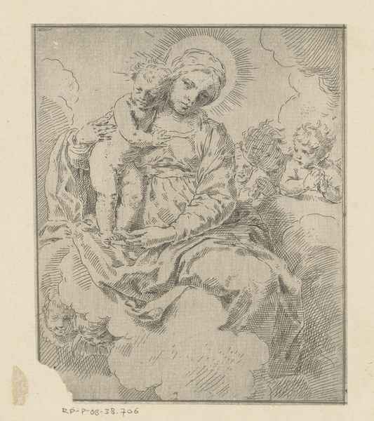 Curator: Here we have "Madonna and Child seated on clouds and surrounded by angels, copy in reverse after Cantarini," a drawing/print dating back to sometime between 1612 and 1648. Editor: My initial impression is of remarkable detail achieved through line work. The way the engraver used line density to model form and create shadows is really striking. Curator: Indeed. The piece invites us to consider the religious and cultural landscape of the Italian Renaissance. This particular Madonna, depicted enthroned in the heavens, reflects a period where the feminine divine was crucial in art. How do you read her expression, in conjunction with those of the angels? Editor: Her downcast gaze and gentle posture towards the child suggest humility and a sense of protectiveness, but, thinking of labor, these depictions of the Madonna often neglect the sheer physical toil of motherhood. How were such prints circulated, and by whom? What socio-economic access did such works afford its audiences? Curator: This print would likely have circulated among the educated elite, primarily wealthy merchants and members of the clergy, reinforcing not only devotion but also their societal status through patronage of the arts. Moreover, how do these compositions portray gender and the role of women, perpetuating, even sanctifying, domestic ideals while denying broader freedoms? Editor: The very act of reproduction through engraving hints at broader issues. It makes me think about the consumption and dissemination of images, as well as the labor required to create this piece; all those precise lines would take a considerable amount of time. This challenges the notion of the artist as solitary genius, forcing us to also consider production networks. Curator: It really illuminates how art and belief were intertwined. Analyzing works like this print demands we confront uncomfortable questions about power, privilege, and representation. Editor: By digging into its production and how it was consumed, we expose the networks through which meaning itself was constructed and, I suppose, commodified.