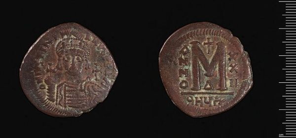 Curator: Isn’t it amazing how something so small can hold so much history? This is a large follis from Constantinople, made under the reign of Anastasios I. Editor: It feels weighty, doesn’t it? Not just physically, but with the weight of centuries. That oxidation creates a beautiful, almost melancholic patina. Curator: Absolutely. Anastasios, whose portrait we see here, implemented important financial reforms, and this coin symbolizes that shift. Editor: And the large 'M' on the reverse, flanked by stars, that’s a clear and bold statement of value. I wonder what stories this particular coin could tell if it could speak? Curator: Probably tales of bustling markets and imperial decrees. To me, these aren’t just artifacts; they're almost like tiny time capsules, carrying echoes of the past. Editor: I agree completely. It's almost magical how an object like this can transcend time, and let us feel connected to a distant past.